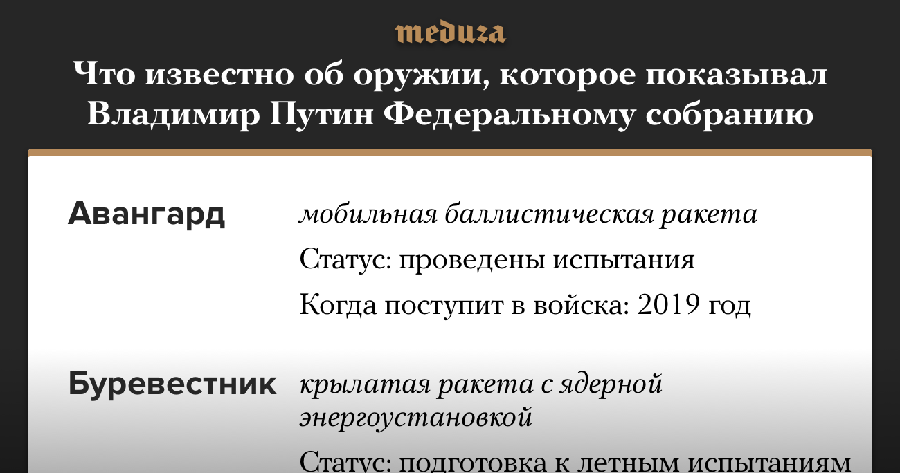 В России испытали ракету «Авангард». А что произошло с другим оружием, которое Путин показывал в послании Федеральному собранию?