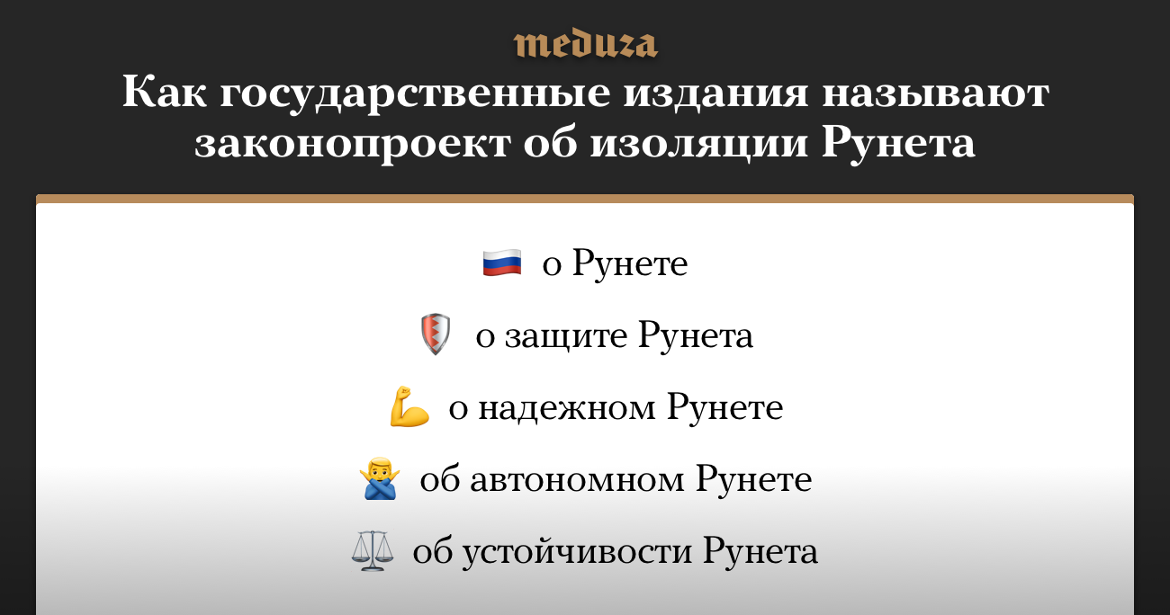 11 апреля Госдума приняла во втором чтении законопроект, который позволяет при определенных условиях изолировать российский сегмент интернета от остального мира. С момента его внесения в декабре 2018 года государственные издания и информационные агентства использовали разные формулировки, описывая, что означает этот документ. Как будет работать законопроект, можно узнать тут.