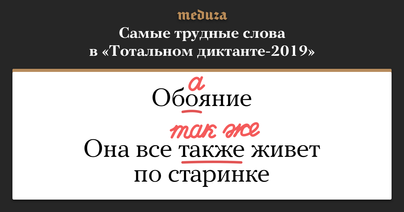 13 апреля в России в 16-й раз прошел «Тотальный диктант», автором текста стал писатель Павел Басинский — он подготовил четыре фрагмента (для трех часовых зон в России и Европе и одной — в Америке). Член экспертного совета «Тотального диктанта» и главред «Грамоты.ру» Владимир Пахомов рассказал «Медузе», что в третьей части (Центральная Россия) наибольшие затруднения вызвало слово «обаяние», а во второй (Западная Сибирь и Урал) — раздельное написание «так же». Все варианты текстов диктанта можно прочитать тут.