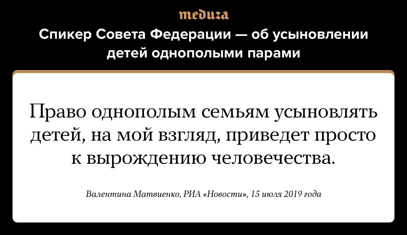 Спикер Совета Федерации Валентина Матвиенко 15 июля выступила на всероссийском молодежном образовательном форуме «Территория смыслов». Она заявила, что фундаментальные основы общества «размываются и подвергаются эрозии». «В законодательстве некоторых государств вместо слов „мама“ и „папа“ введены новые понятия — „родитель номер один“ и „родитель номер два“. Можно ли представить, что вместо первого слова „мама“ младенец произнесет „родитель номер один“?» — сказала Матвиенко.