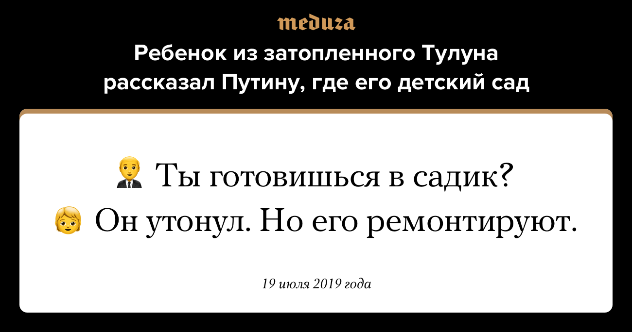 Президент РФ Владимир Путин во время поездки в Тулун в Иркутской области посетил временный пункт, где разместили людей, пострадавших от наводнения. Там он поговорил с шестилетним Матвеем Сафроновым, чей дом был разрушен во время потопа. Мальчик рассказал президенту, что в сентябре собирается вернуться в детский сад, также пострадавший от стихийного бедствия. В результате наводнения в Иркутской области погибли 25 человек, всего пострадали более 38 тысяч человек.