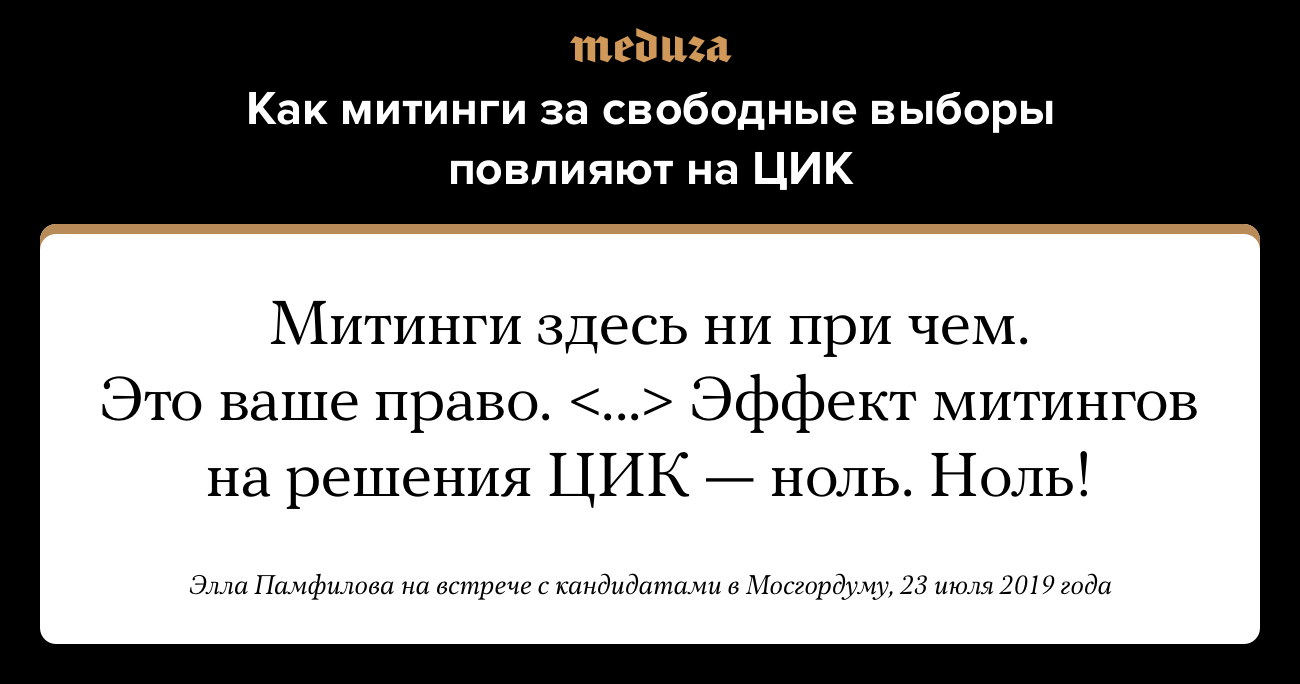 23 июля в ЦИК проходит встреча главы комиссии Эллы Памфиловой с независимыми кандидатами в Мосгордуму, которых не зарегистрировали на выборы окружные избиркомы. Памфилова пообещала «объективно рассмотреть все проблемы», однако подчеркнула, что <a href="https://open-mind-network.online/feature/2019/07/20/podnimite-pasporta-i-skazhite-my-est" target="_blank">протестные акции</a> не влияют на решения ЦИК.