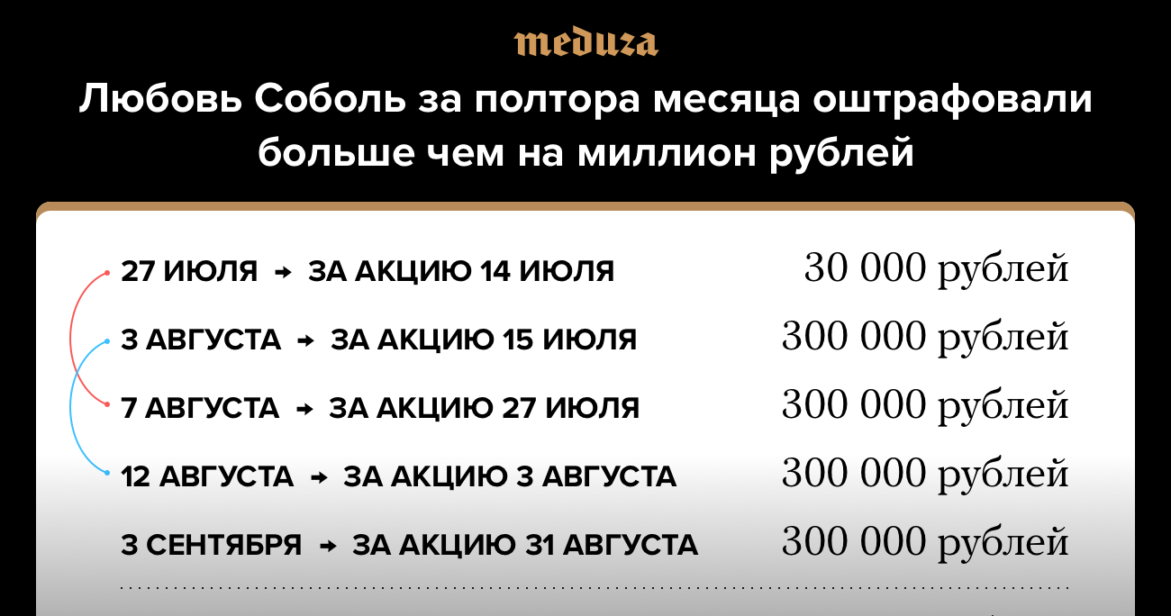 3 сентября Троицкий суд Москвы оштрафовал незарегистрированного кандидата в Мосгордуму Любовь Соболь на 300 тысяч рублей за несанкционированное шествие 31 августа. Для Соболь это уже пятый за полтора месяца штраф, назначенный за акции в поддержку независимых кандидатов в Мосгордуму. Соболь, в отличие от многих других кандидатов, призывавших выходить на митинги и шествия, не отправляли под административный арест, так как у нее есть малолетний ребенок. Вместо этого ей каждый раз назначали максимальную сумму штрафа.