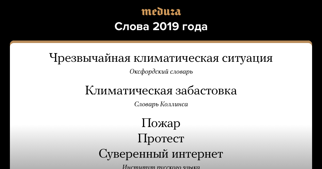 Филологи и составители толковых словарей выбрали главные слова 2019 года. У британских Оксфордского словаря и словаря Коллинса они связаны с проблемой изменения климата — это «climate emergency» («чрезвычайная климатическая ситуация») и «climate strike» («климатическая забастовка») соотвественно. Американский онлайн-словарь Dictionary.com выбрал слово «existential» («экзистенциальный»). Государственный институт русского языка имени А. С. Пушкина назвал наиболее употребимыми в СМИ словами «пожар», «протест» и «суверенный интернет».