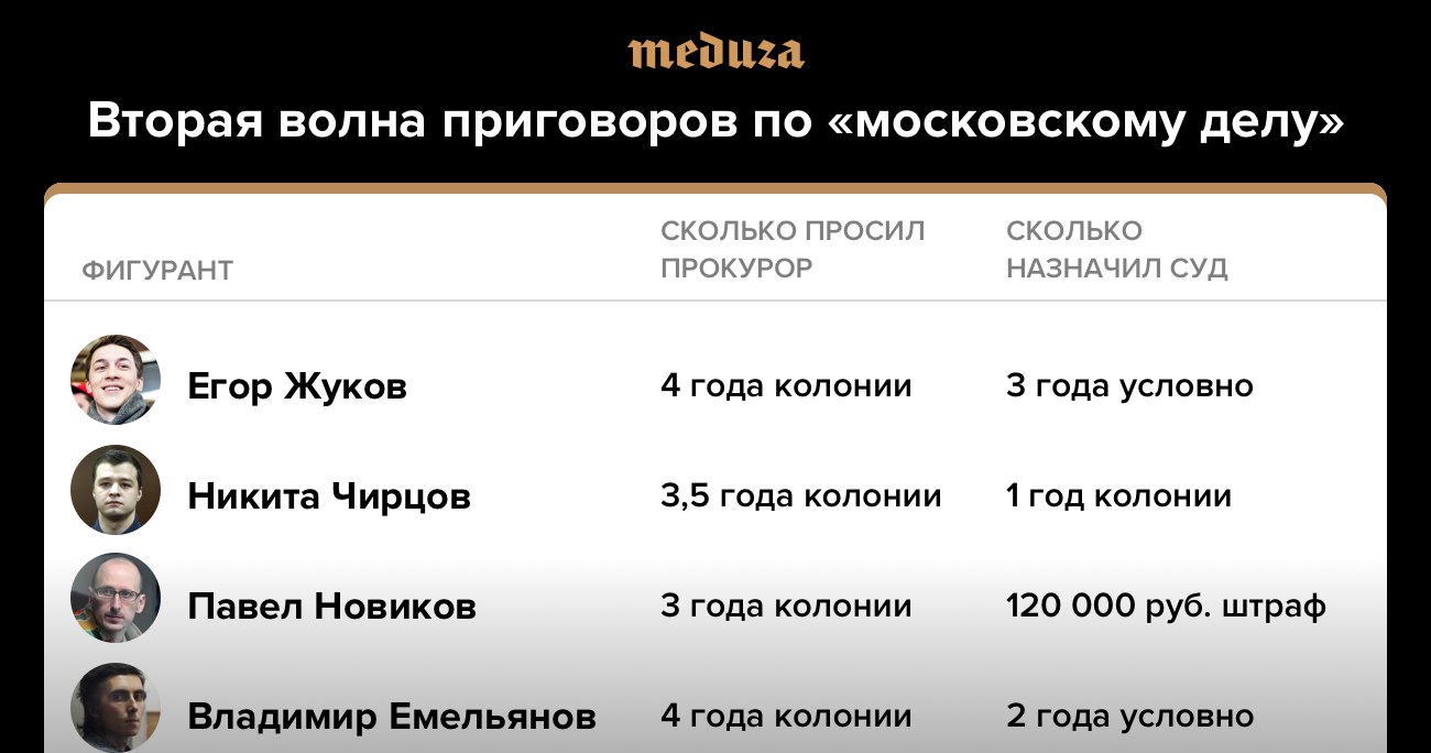 6 декабря суды Москвы вынесли сразу семь приговоров по так называемому «московскому делу», заведенному по статье о массовых беспорядках после летних протестных акций в столице. Павлу Новикову назначили 120 тысяч рублей штрафа, Егору Жукову, Александру Мыльникову и Владимиру Емельянову — условный срок, Никите Чирцову, Егору Лесных и Максиму Мартинцову — от одного до трех лет колонии. Ранее по этому «московскому делу» шестеро фигурантов уже были приговорены к реальным срокам лишения свободы, один — осужден условно.
