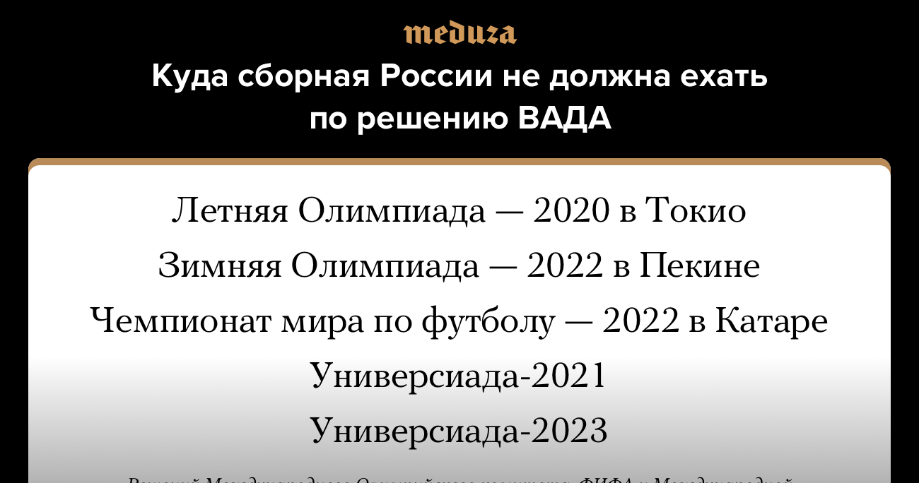 ВАДА отстранила Россию на четыре года от крупнейших спортивных соревнований, а также запретила проводить их у себя. Это значит, что на Олимпиады российские спортсмены, похоже, опять поедут под белыми флагами, и после побед им не станут включать российский гимн. Универсиада-2023 вообще должна была пройти в России, и теперь, видимо, не пройдет, если суд не отменит решение ВАДА. На Чемпионат мира по футболу, согласно правилам ФИФА, не могут приехать «нейтральные» спортсмены, только сборные, так что Россия, по решению ВАДА, должна пропустить и его. Важно, что пока официально федерации и Олимпийский комитет не выступали с заявлениями: куда не пустят сборные, окончательно станет ясно после этого.