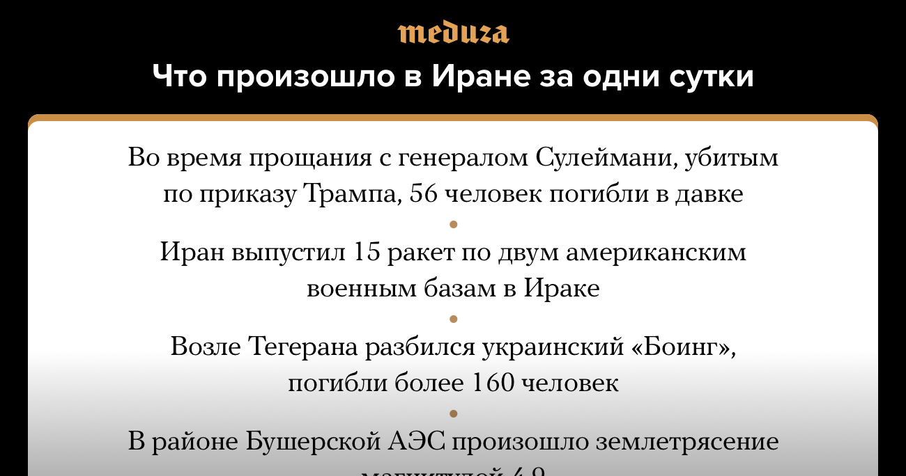 После гибели иранского военачальника Касема Сулеймани, который отвечал за диверсионные операции Ирана за рубежом, ситуация в регионе резко обострилась. Убийство совершили по приказу Дональда Трампа. Иранские власти пообещали отомстить США за гибель генерала, и его смерть вызвала волну патриотического подъема в этой стране.