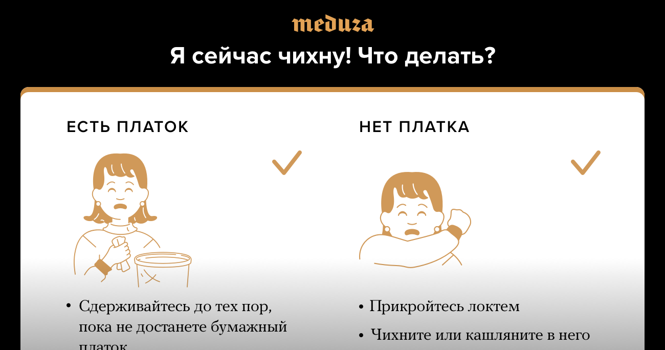 Чтобы никого не заразить, нужно правильно чихать и кашлять. Распечатайте этот плакат и повесьте на видном месте