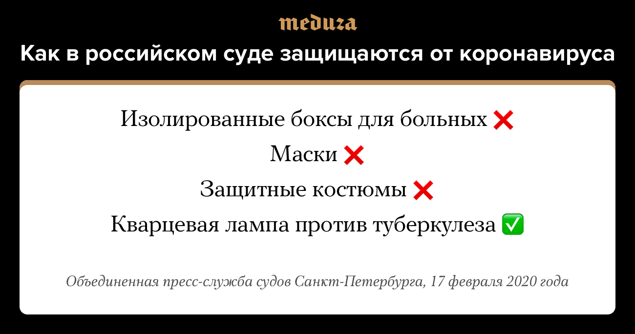 Петроградский районный суд Санкт-Петербурга 17 февраля принял решение о принудительной госпитализации Аллы Ильиной, сбежавшей из коронавирусного карантина. Женщина должна будет пробыть в больнице как минимум два дня, пока не будут получены результаты ее анализов. Во время заседания для его участников не было предусмотрено никаких мер антивирусной защиты кроме дезинфицирующей лампы по аналогии с заседаниями, в которых участвуют люди с открытой формой туберкулеза.