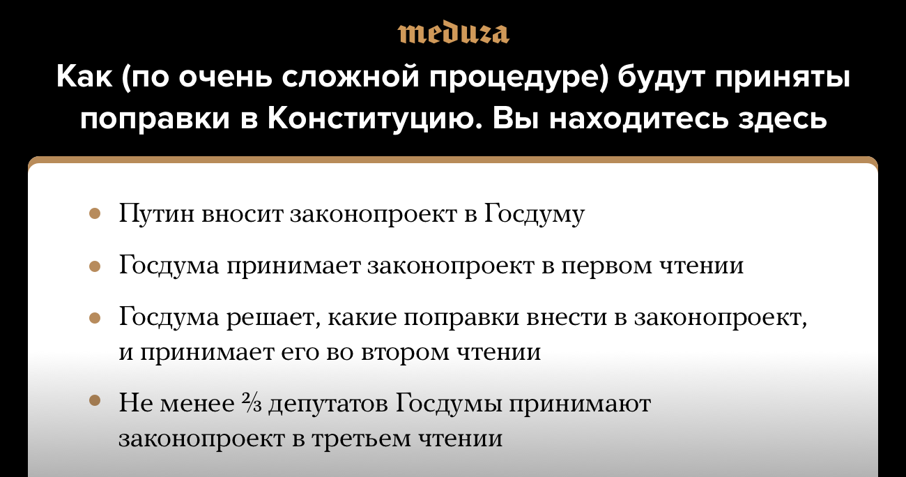 Источники: Конституция РФ, федеральный закон «О порядке принятия и вступления в силу поправок к Конституции Российской Федерации» и президентские поправки к президентскому законопроекту о поправке к Конституции