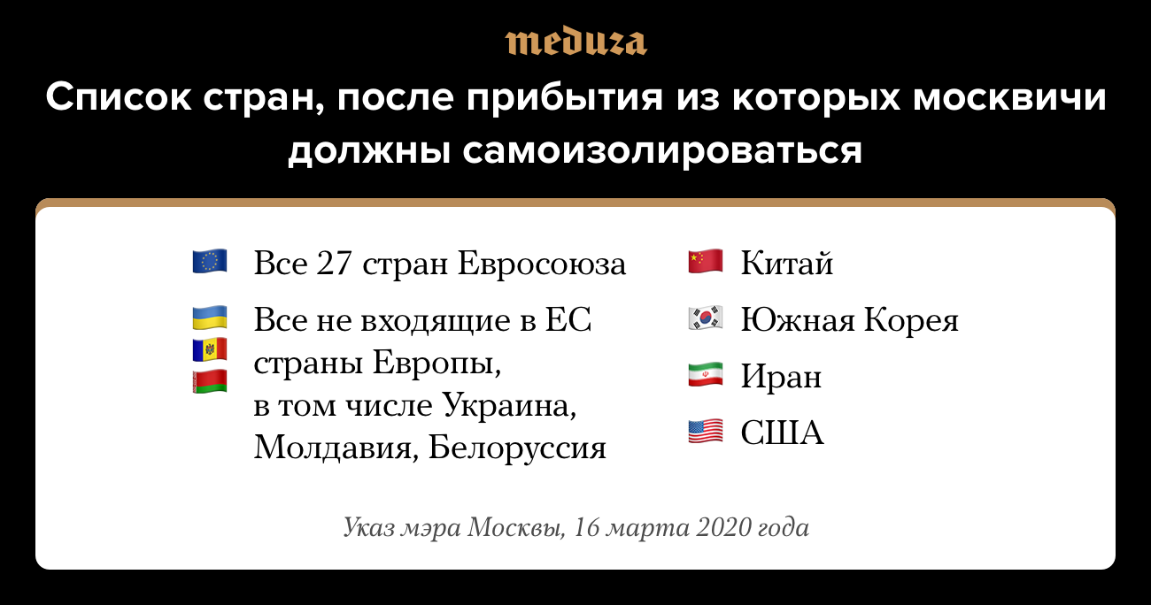 Мэр Москвы Сергей Собянин расширил список стран, после возвращения из которых все жители города должны отправиться на двухнедельную самоизоляцию — не ходить на работу и учебу, а также минимизировать посещение общественных мест. Теперь в этом списке все страны Европы.