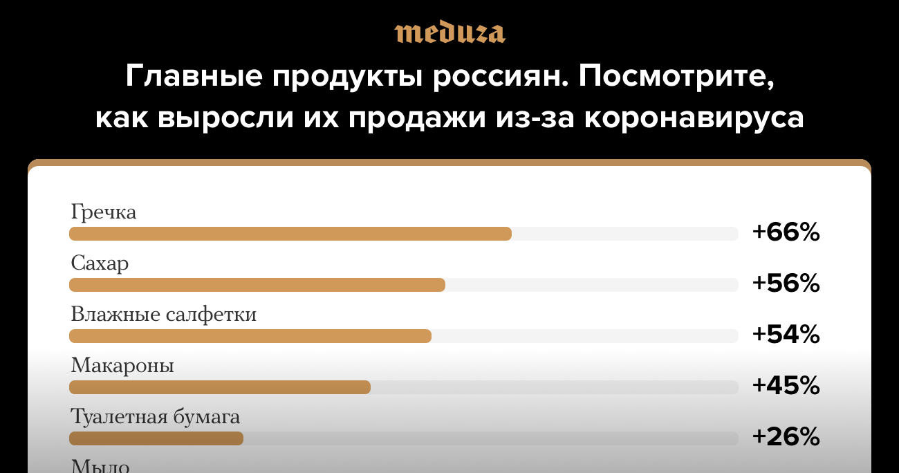 С начала марта российские регионы по очереди вводят режим повышенной готовности из-за коронавируса. На фоне этого многие россияне решили сделать запасы продуктов. Данные компании Nielsen, которые публикует «Интерфакс», показывают, спрос на какие товары, «ассоциирующихся с подготовкой к карантину», больше всего вырос по всей России в период с 9 по 15 марта. Для всех продуктов, кроме алкоголя, продажи сравниваются с аналогичным периодом годом ранее, для пива и водки — с результатами предыдущей недели.
