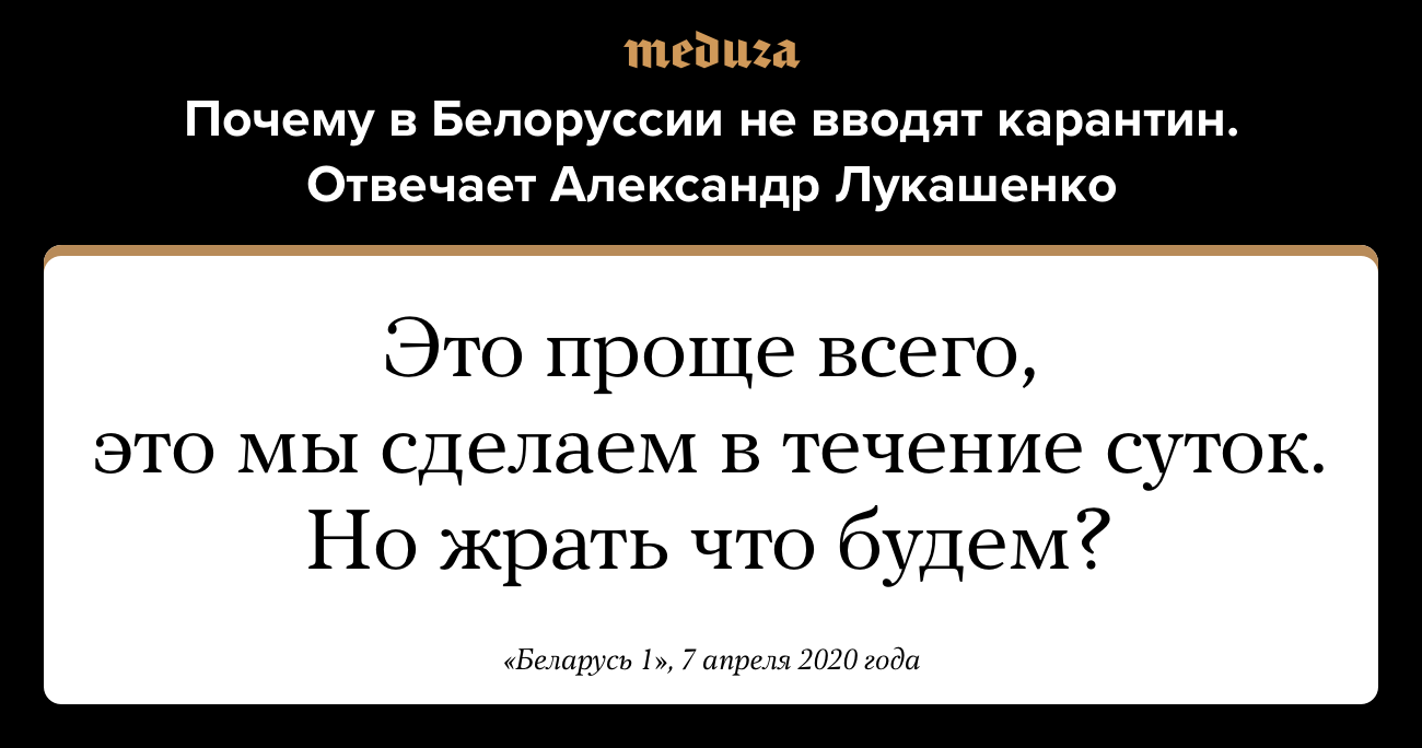Президент Белоруссии Александр Лукашенко в очередной раз объяснил, почему он не вводит в стране карантин по коронавирусу — несмотря на то, что онлайн-петиция с требованием об этом набрала 150 тысяч подписей. По словам Лукашенко, введение карантина поставило бы под угрозу продовольственную безопасность («У нас тут разглагольствуют кругом: карантин, комендантский час и прочее. Слушайте, это проще всего, это мы сделаем в течение суток, но жрать что будем?») и внесло бы раскол в общество («Как там на „удаленке“ доить коров или выходной объявить? <…> А кто-то будет сидеть дома без работы, и им зарплату сохранять. Это что, справедливо?»).