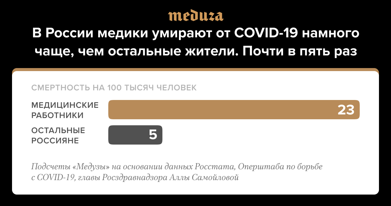 Глава Росздравнадзора Алла Самойлова заявила, что с начала эпидемии ковида в России от болезни умерли 489 медицинских работников (позже пресс-служба ведомства заявила, что цифры, о которых она говорила — неофициальные). В 147-миллионной России, по данным Росстата, в 2019 году было 2,14 миллиона медицинских работников (в это число входят врачи, средний и младший медицинский и фармацевтический персонал). При общем количестве в 7660 смертей от коронавируса в России это означает, что медики умирают от болезни почти в пять раз чаще, чем остальные жители РФ. При этом в конце мая — спустя более двух месяцев после начала эпидемии — глава Роспотребнадзора Анна Попова утверждала, что смертность среди медработников не выше, чем в среднем по стране.