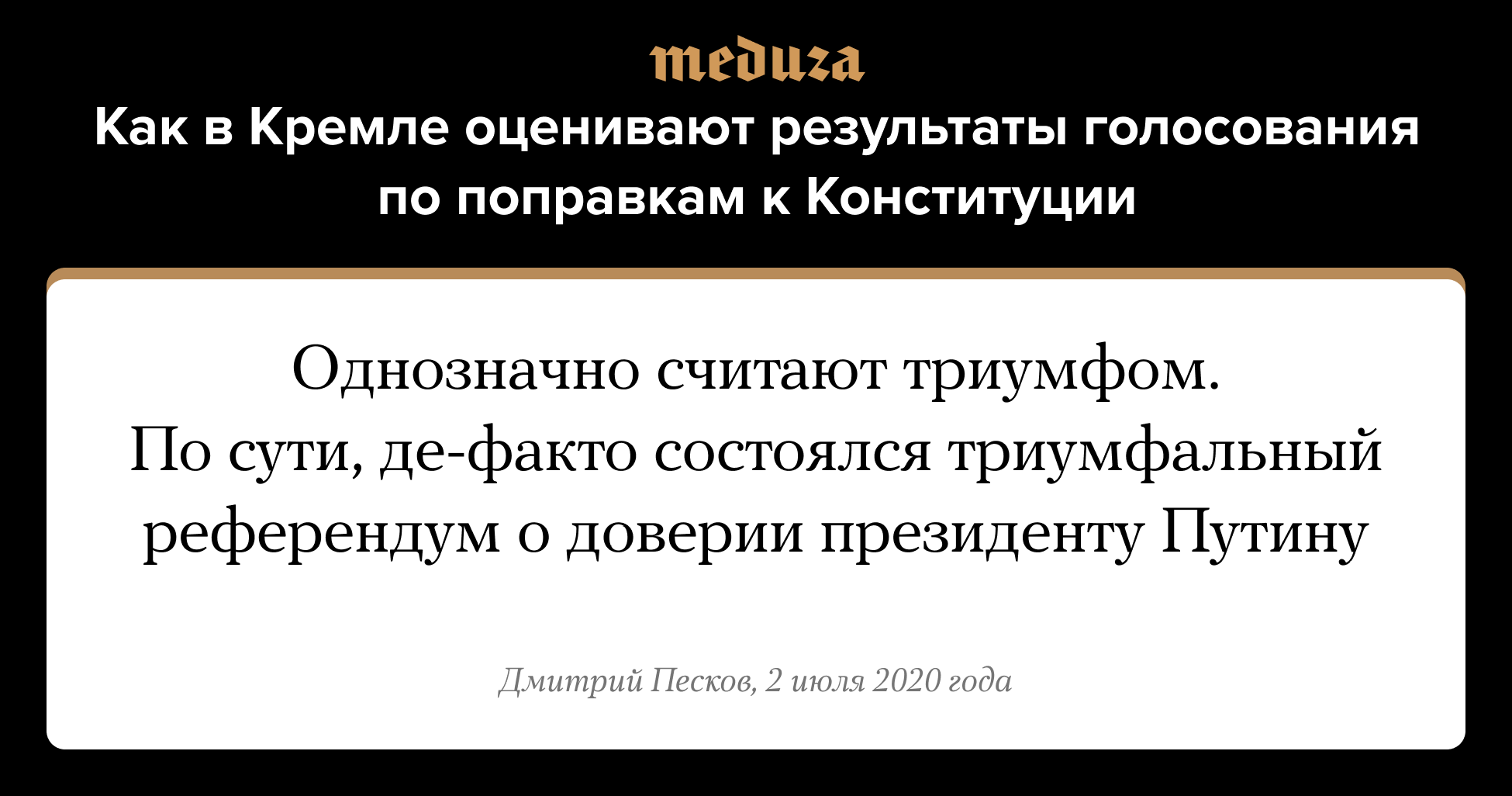 В России прошло голосование по поправкам к Конституции, среди которых обнуление президентских сроков, позволяющее Владимиру Путину вновь баллотироваться на пост главы государства. По данным ЦИК, поправки поддержали почти 78% проголосовавших, явка была около 65%. Дмитрий Песков, отвечая на вопрос журналистов, как в Кремле оценивают результаты голосования, назвал их триумфом. «Легко прогнозировался высокий интерес к теме поправок, — заявил Песков. — Но, конечно, такую высочайшую явку и высочайший уровень поддержки, который на сегодняшний день уже отфиксирован, было спрогнозировать очень сложно».