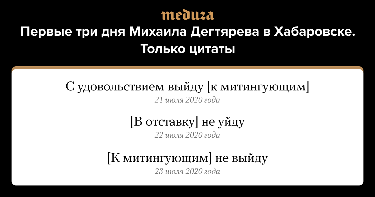 20 июля президент России Владимир Путин уволил Сергея Фургала, обвиненного в убийствах и покушениях, с поста губернатора Хабаровского края. Врио главы края стал депутат Госдумы Михаил Дегтярев. 21 июля он прилетел в Хабаровск и рассказал, что у него под окнами кричали «Дегтярев, выходи!» (очевидно, это были местные жители, митингующие в поддержку Фургала). Дегтярев пообещал, что «с удовольствием» выйдет к жителям Хабаровска — но позже, так как есть «первоочередные задачи». 22 июля Дегтярев снова прокомментировал призывы протестующих: «Те, кто кричат „Дегтярев, уходи“ — не уйду! Потому что работать надо, понимаете?». А 23 июля новый глава Хабаровского края заявил, что не будет общаться с теми, «кто кричит под окнами»: «Не выйду. Я выхожу к людям постоянно, но я общаюсь с людьми в форматах корректных».