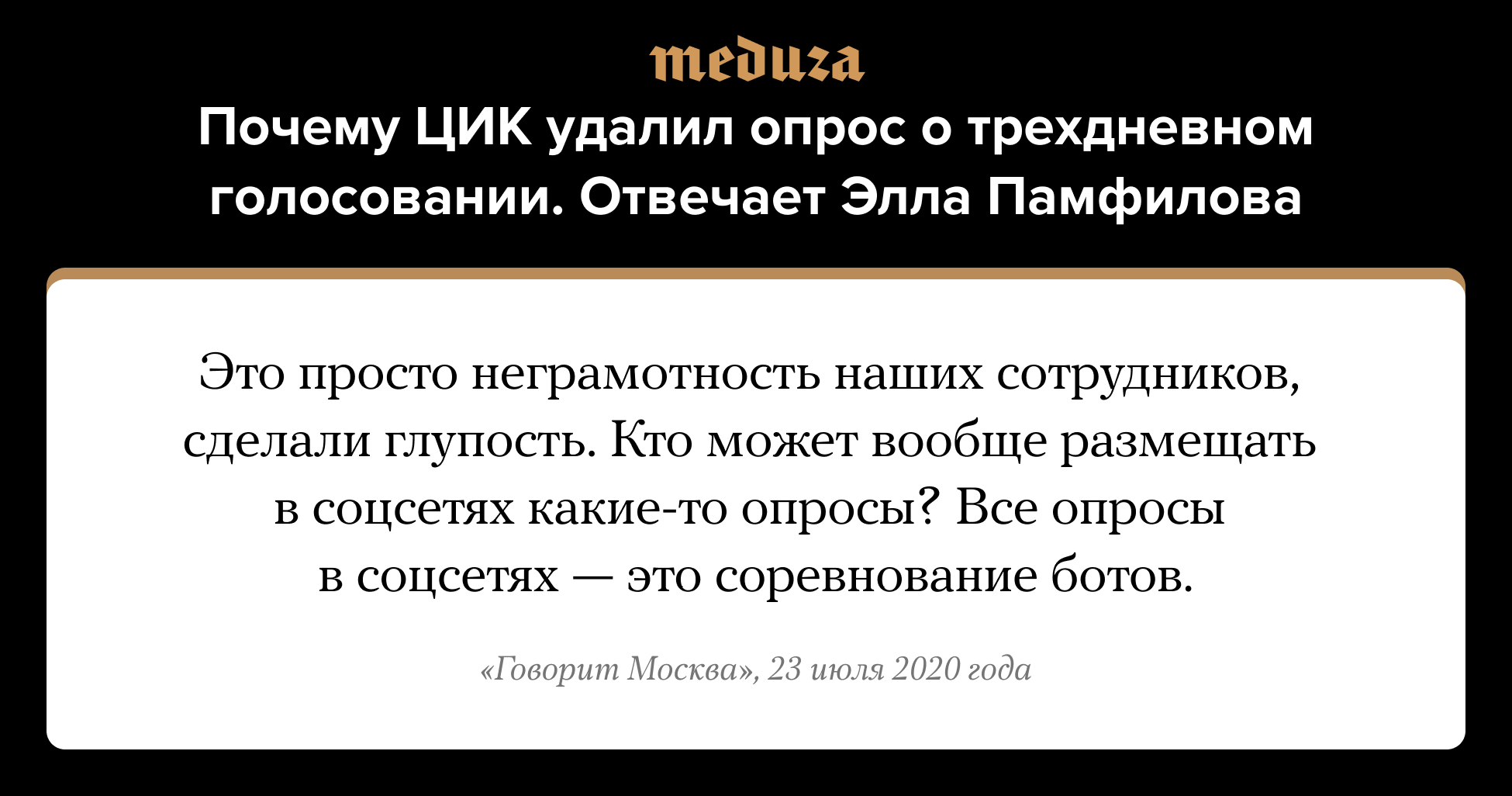 21 июля Госдума разрешила проводить голосование на выборах в течение трех дней. 22 июля в твиттере ЦИК появился опрос «Считаете ли вы удобной практику голосования в течение нескольких дней?». Абсолютное большинство его участников выбрали ответ «Нет». После этого опрос удалили. 23 июля глава ЦИК Элла Памфилова объяснила публикацию опроса некомпетентностью сотрудников. «Я сегодня дам распоряжение вообще все убрать, потому что глупость. Это нерепрезентативно», — сказала Памфилова радиостанции «Говорит Москва». Опрос, аналогичный опубликованному в твиттере ЦИК, был размещен и на странице комиссии во «ВКонтакте». Его не удаляли.
