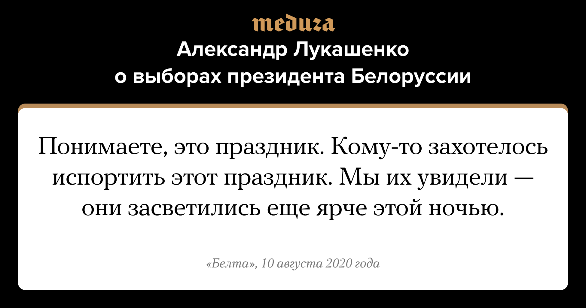9 августа в Белоруссии прошли выборы президента. По предварительным данным ЦИК, победу на выборах в очередной раз одержал Александр Лукашенко, набрав более 80% голосов. Вечером 9 августа на улицы Минска и других городов на акции протеста вышли тысячи человек. По данным МВД Белоруссии, были задержаны три тысячи демонстрантов, почти 100 человек — участников акций и милиционеров — пострадали в столкновениях. Кандидат от оппозиции Светлана Тихановская объявила себя победителем выборов, заявив о многочисленных нарушениях. Лукашенко, в свою очередь, сообщил, что на участки для голосования люди шли как на праздник — семьями, «с маленьким детишками», а протесты были инициированы из-за границы — «управляли нашими, извините меня, овцами».