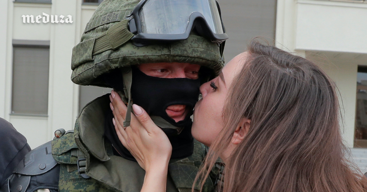 Протестующие обнимают (и даже целуют) военных у Дома правительства Беларуси. Фотография