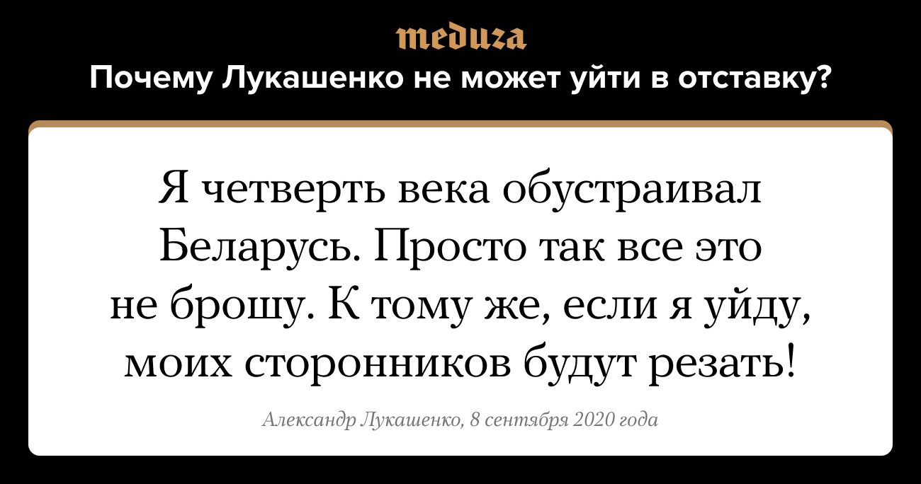 8 сентября Александр Лукашенко дал в Минске интервью представителям четырех российских СМИ. В ходе него он, в частности, признал, что «возможно, немного пересидел» в кресле президента Беларуси. Но при этом заявил, что просто так не уйдет со своего поста. Цитату из разговора приводит главный редактор радиостанции «Говорит Москва» Роман Бабаян, участвовавший в беседе с Лукашенко. Само интервью пока не опубликовано.