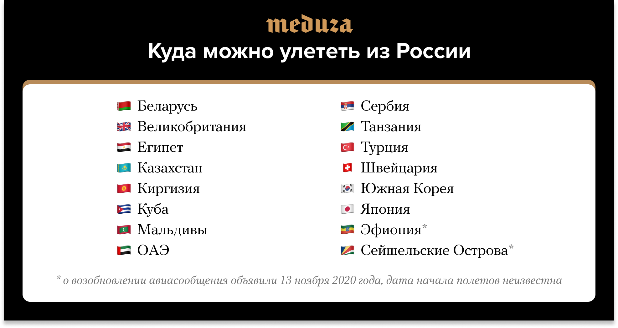 Россия возобновит авиасообщение с Эфиопией и Сейшельскими островами, объявило правительство РФ 13 ноября. Число стран, куда можно улететь из российских городов, таким образом увеличится до 16. В этот список входят только страны, о возобновлении авиасообщения с которыми официально объявляло правительство РФ. Из России выполняются полеты и в другие страны, например «вывозные» или «грузовые» рейсы. Россия в августе начала восстанавливать авиасообщение, приостановленное в марте на фоне пандемии коронавируса. До пандемии из России можно было улететь почти в 190 стран мира.