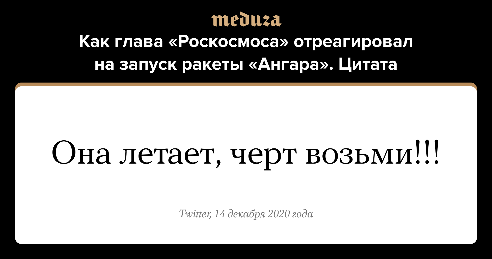 Утром 14 декабря с космодрома Плесецк запустили тяжелую ракету-носитель «Ангара-А5» с макетом полезной нагрузки. Предстартовая подготовка и старт прошли в штатном режиме. Это был второй испытательный пуск тяжелой ракеты «Ангара» — в предыдущий раз ее запустили в декабре 2014 года. Глава «Роскосмоса» Дмитрий Рогозин отреагировал на второй запуск ракеты твитом «Она летает, черт возьми!!!». В 2018 году глава SpaceX Илон Маск похожим образом прокомментировал первый запуск тяжелой ракеты-носителя Falcon Heavy с автомобилем Tesla. «****** [черт возьми], эта штука взлетела!» — воскликнул он.