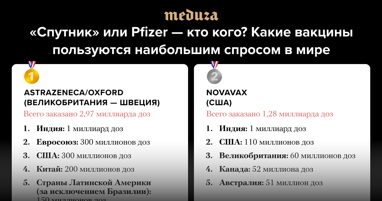 «Спутник» или Pfizer — кто кого? Какие вакцины пользуются наибольшим спросом в мире. В одной картинке