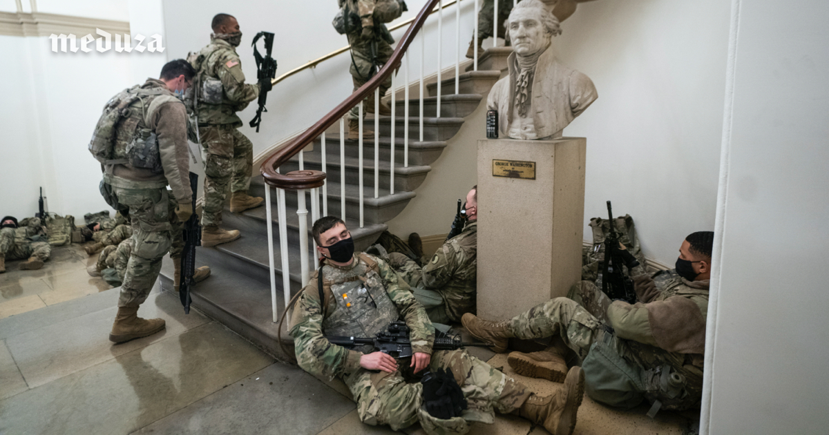 Бойцы Национальной гвардии отдыхают под лестницей в Капитолии в Вашингтоне, где 13 января рассматривается вопрос об импичменте президента Дональда Трампа. Неделей ранее сторонники президента штурмом взяли Капитолий, пытаясь сорвать заседание, на котором были официально утверждены итоги выборов, проигранных Трампом. В результате столкновений погибли пять человек. После этого штурма к охране Капитолия привлекли силы Национальной гвардии.