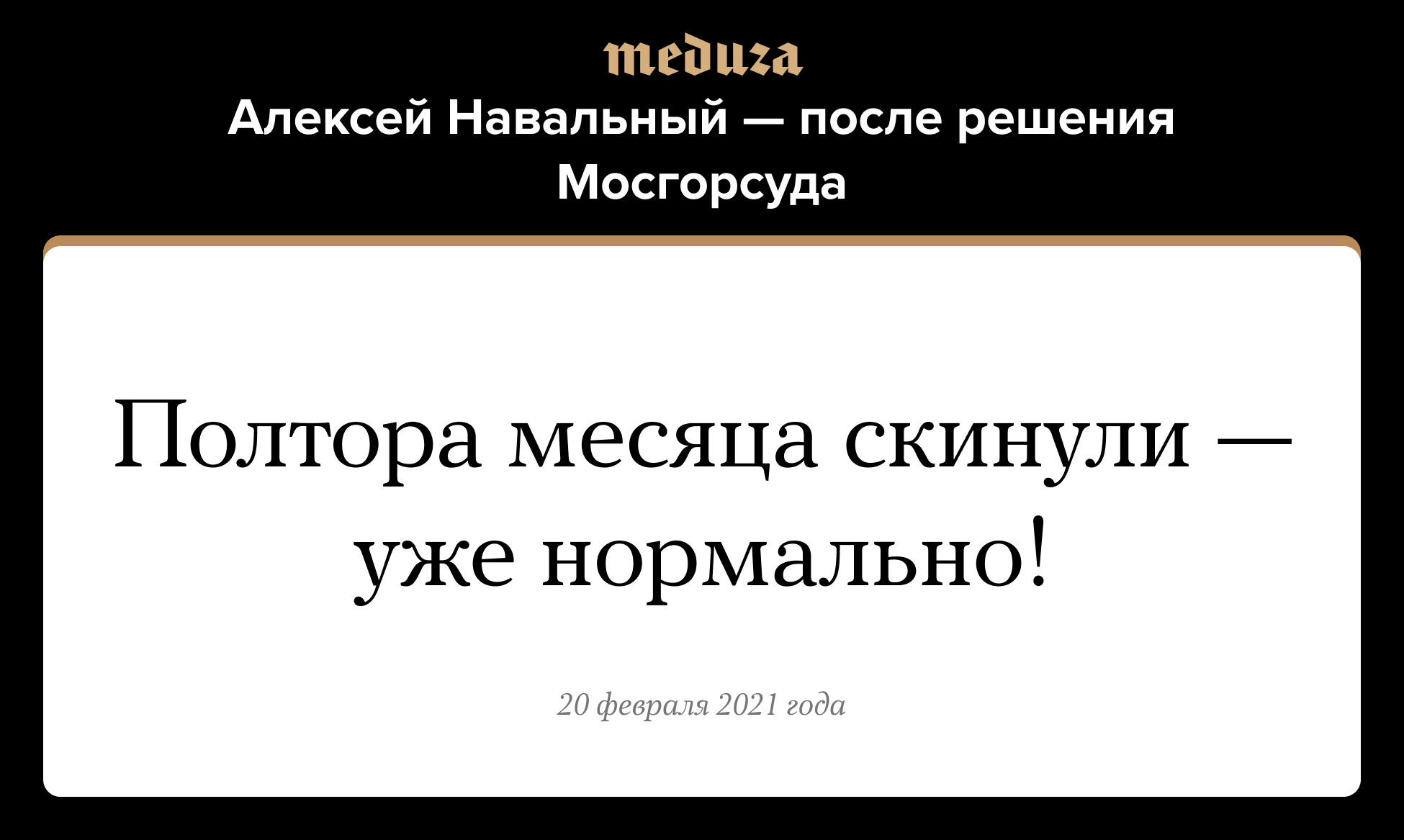 Мосгорсуд 20 февраля оставил в силе решение Симоновского суда Москвы, который заменил Алексею Навальному условный срок на реальный по делу «Ив Роше». Единственное изменение — суд решил учесть в приговоре полтора месяца, которые Навальный провел под домашним арестом. Таким образом, ему предстоит отбыть в колонии два года, шесть месяцев и две недели.