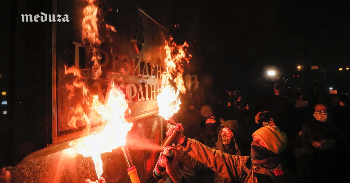 Протестующие поджигают вывеску «Президент Украины» на здании офиса Владимира Зеленского. Фотография