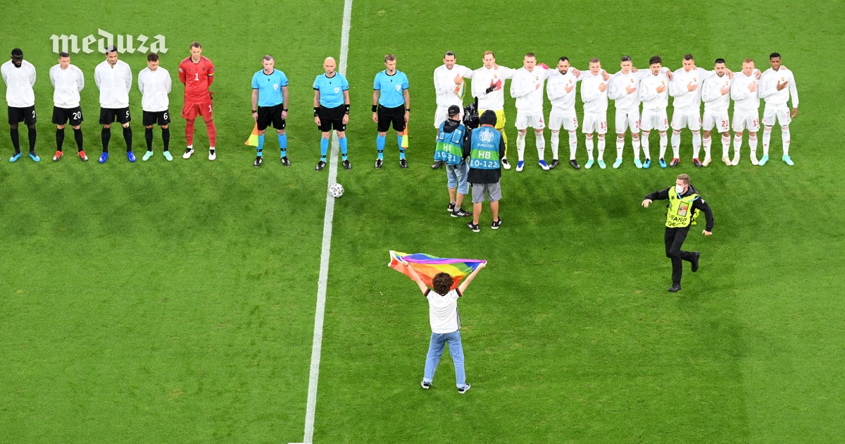 Перед началом матча Германия — Венгрия на Евро-2020 на поле стадиона в Мюнхене выбежал активист с радужным флагом. Он поднял его на глазах у футболистов во время исполнения гимна Венгрии. Неделю назад парламент Венгрии принял закон, который запрещает распространять в школах материалы о гомосексуальности и трансгендерности. Против этого закона выступили многие страны ЕС.