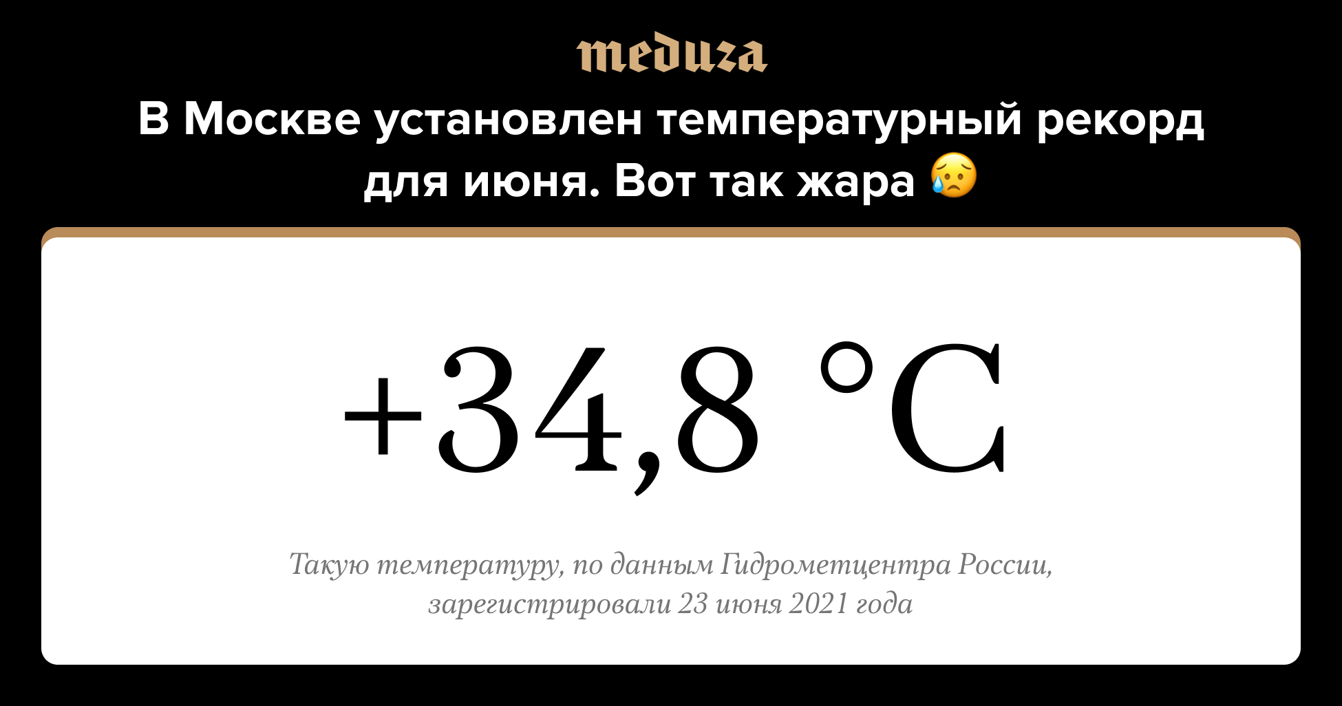 23 июня 2021 года в Москве зарегистрировали абсолютный температурный максимум для всего июня — воздух в городе, по данным Гидрометцентра, прогрелся до 34,8 градуса. До этого рекордной для июня в Москве считалась температура 34,7 градуса, которую зафиксировали 21 июня 1901 года. В Москве и Московской области несколько дней наблюдают аномальную жару — температура выше нормы на семь-десять градусов. Синоптики прогнозируют, что высокие температуры сохранятся до конца недели, а кратковременные дожди возможны не раньше субботы, 26 июня.