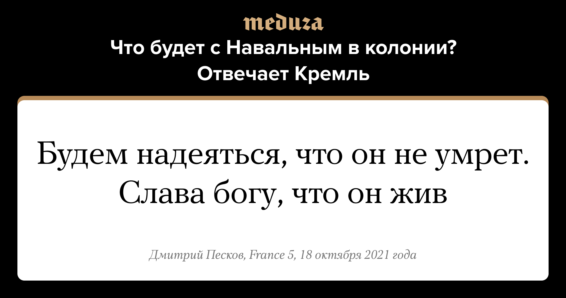 Пресс-секретарь президента РФ Дмитрий Песков выразил надежду на то, что политик Алексей Навальный не умрет в исправительной колонии, где он отбывает срок по делу «Ив Роше». Об этом представитель Кремля заявил в интервью для документального фильма «Путин: мастер игры» (Poutine, le maître du jeu) французского телеканала France 5. На вопрос, не побаивается ли российская власть Алексея Навального, Песков ответил отрицательно, добавив, что Кремль отказывается называть оппозиционера по имени, потому что не хочет делиться с ним своей популярностью.