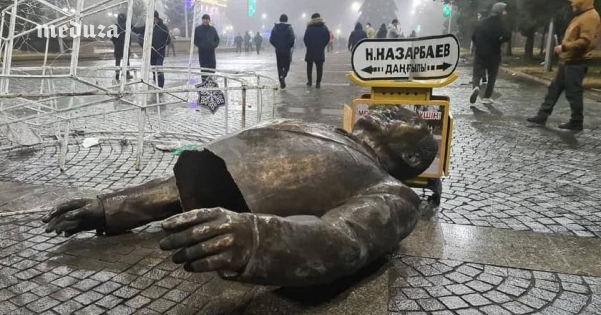 В городе Талдыкорган протестующие снесли памятник первому президенту Казахстана Нурсултану Назарбаеву. Это произошло вскоре после того, как действующий глава государства Касым-Жомарт Токаев в своем обращении к нации заявил, что сменил Назарбаева на посту главы Совета безопасности Казахстана. Сам Назарбаев ни разу не выступал с публичными заявлениями с начала протестов.