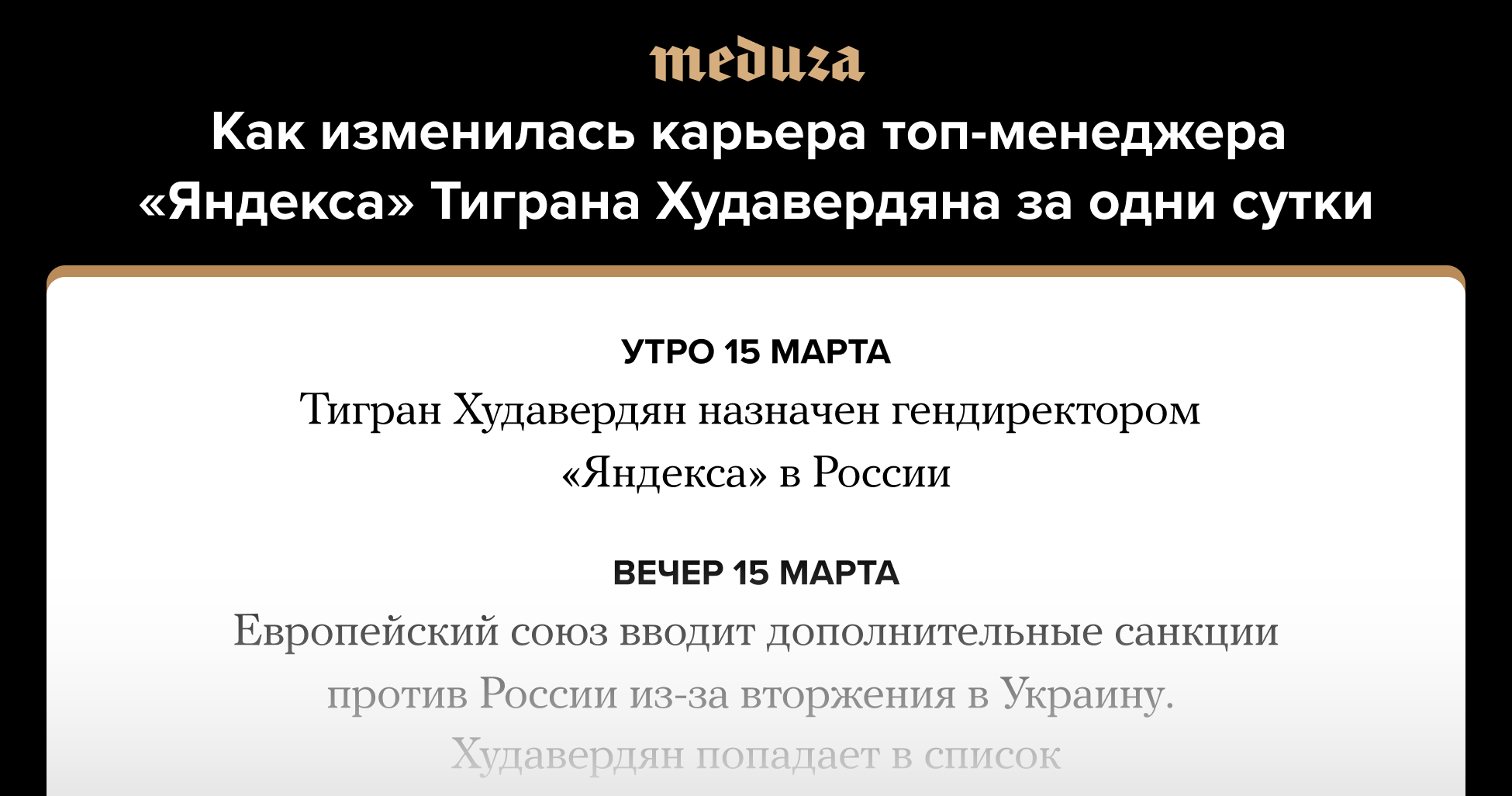 Один из руководителей «Яндекса» Тигран Худавердян покидает совет директоров и пост заместителя генерального директора материнской компании холдинга Yandex N.V., а также уходит со своих должностей в его голландских «дочках». Это произошло после того, как ЕС объявил о персональных санкциях в отношении Худавердяна на фоне российского вторжения в Украину. Накануне топ-менеджер, с 2019 года работавший управляющим директором группы компаний «Яндекса», стал гендиректором компании в России. Согласно пресс-релизу, исполнять обязанности гендиректора российского «Яндекса» до 15 апреля будет Елена Бунина, которую Худавердян должен был заменить. Неясно, означает ли это, что вступление Худавердяна в должность приостановлено или его назначение вообще отменено.