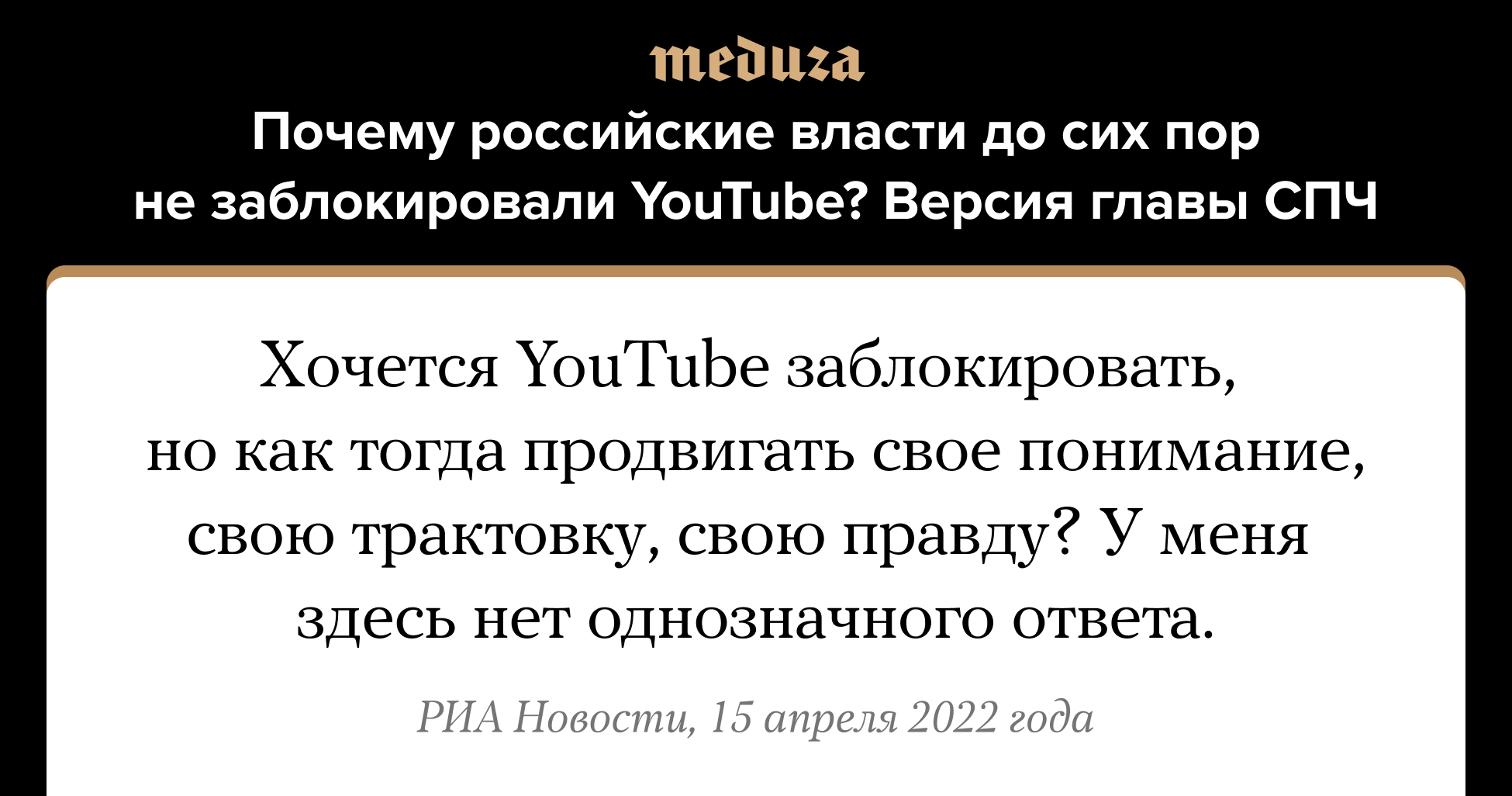 Глава Совета по правам человека при президенте РФ Валерий Фадеев дал интервью РИА Новости. Фадеева спросили в том числе о том, стоит ли российским властям блокировать видеохостинг YouTube из-за его «политики по цензурированию российских СМИ». Глава СПЧ заявил, что у него «двоякое отношение» к идее блокировки YouTube. «С одной стороны, YouTube, конечно, — инструмент по распространению фейков и ложной информации об операции на Украине. С другой стороны, если заблокировать YouTube, тогда мы потеряем инструмент для распространения той информации, которую мы считаем нужной, правдивой информацией. И это непростая история. Хочется YouTube заблокировать, но как тогда продвигать свое понимание, свою трактовку, свою правду? У меня здесь нет однозначного ответа», — заявил Фадеев. С начала войны в Украине Роскомнадзор практически каждый день высказывал претензии к YouTube. А когда на прошлой неделе сервис заблокировал аккаунт телевидения Госдумы, в российском МИДе заявили, что YouTube «подписал себе приговор».