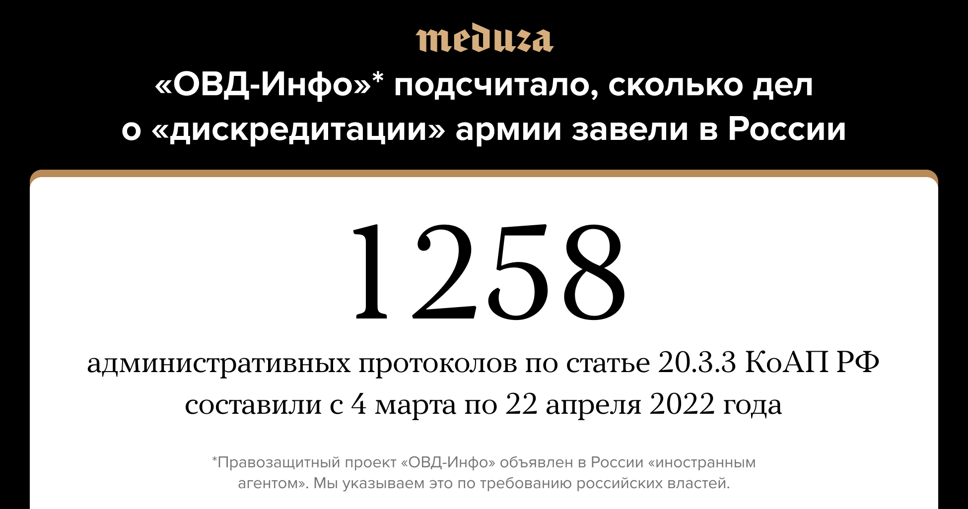 В России все чаще составляют административные протоколы по новой статье о «дискредитации» вооруженных сил РФ. Статья 20.3.3 КоАП РФ появилась 4 марта 2022 года. С тех пор, по данным «ОВД-Инфо» на 22 апреля, в России составили 1258 административных протоколов о «дискредитации» армии. Для сравнения: к 11 апреля в России завели 610 таких дел. За все время больше всего дел возбудили в Москве (195), Краснодарском крае (78), Калининградской области (62), Петербурге (58) и Томской области (56). Правозащитный проект «ОВД-Инфо» объявлен в России «иностранным агентом» (как и многие другие организации и люди). Мы вынуждены указывать это по требованию российских властей.