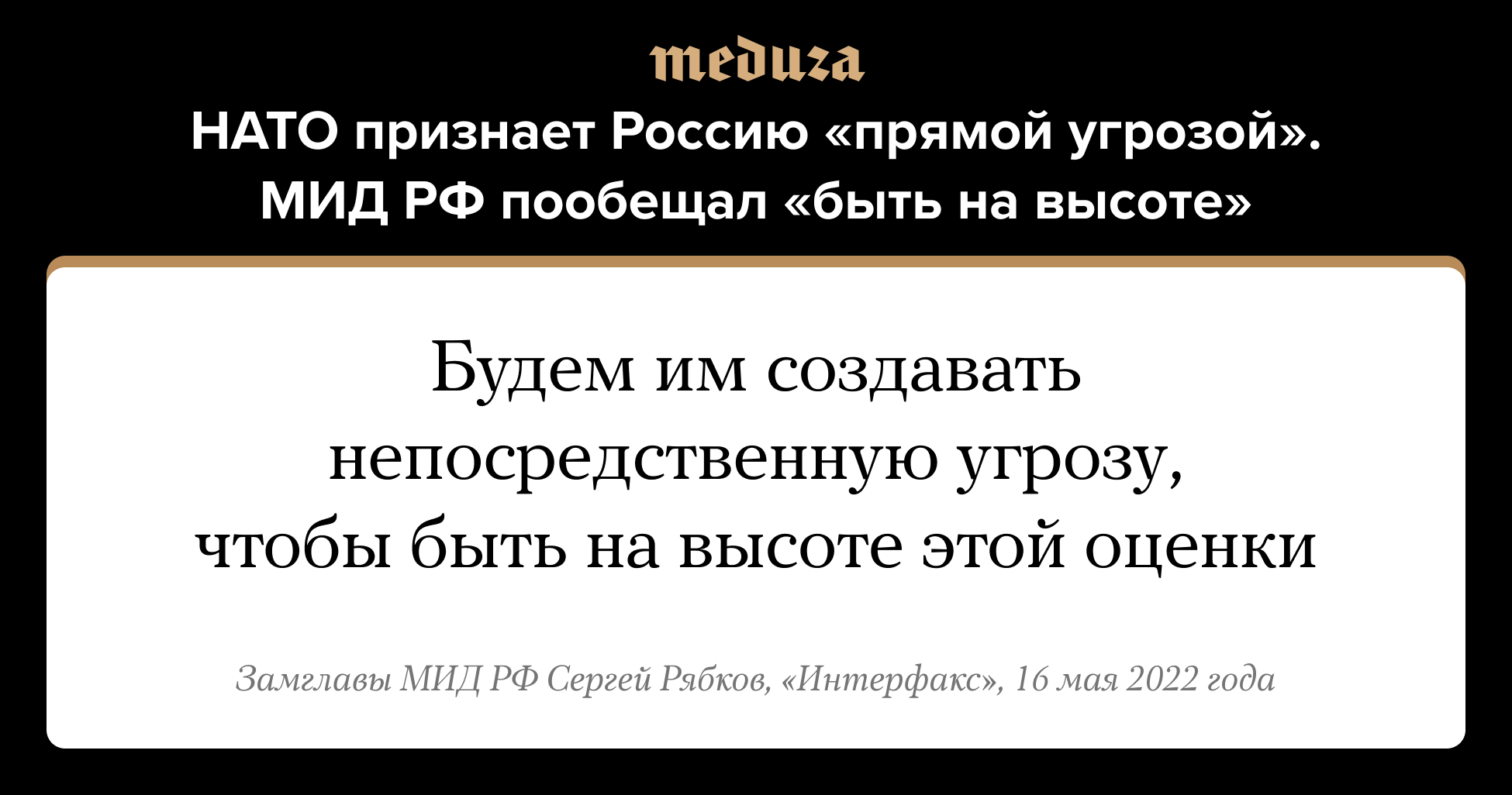Заместитель министра иностранных дел РФ Сергей Рябков прокомментировал «Интерфаксу» планы НАТО обозначить действия России как «прямую угрозу» (или «непосредственную угрозу»). Рябков заявил, что Россия будет «создавать непосредственную угрозу» НАТО, чтобы соответствовать такой оценке. В прежней концепции НАТО, принятой в 2010 году, Россия была обозначена там как «партнер». 15 мая Финляндия, которая имеет более 1200 километров общей границы с Россией, а также Швеция официально объявили, что подадут заявки на вступление в НАТО.