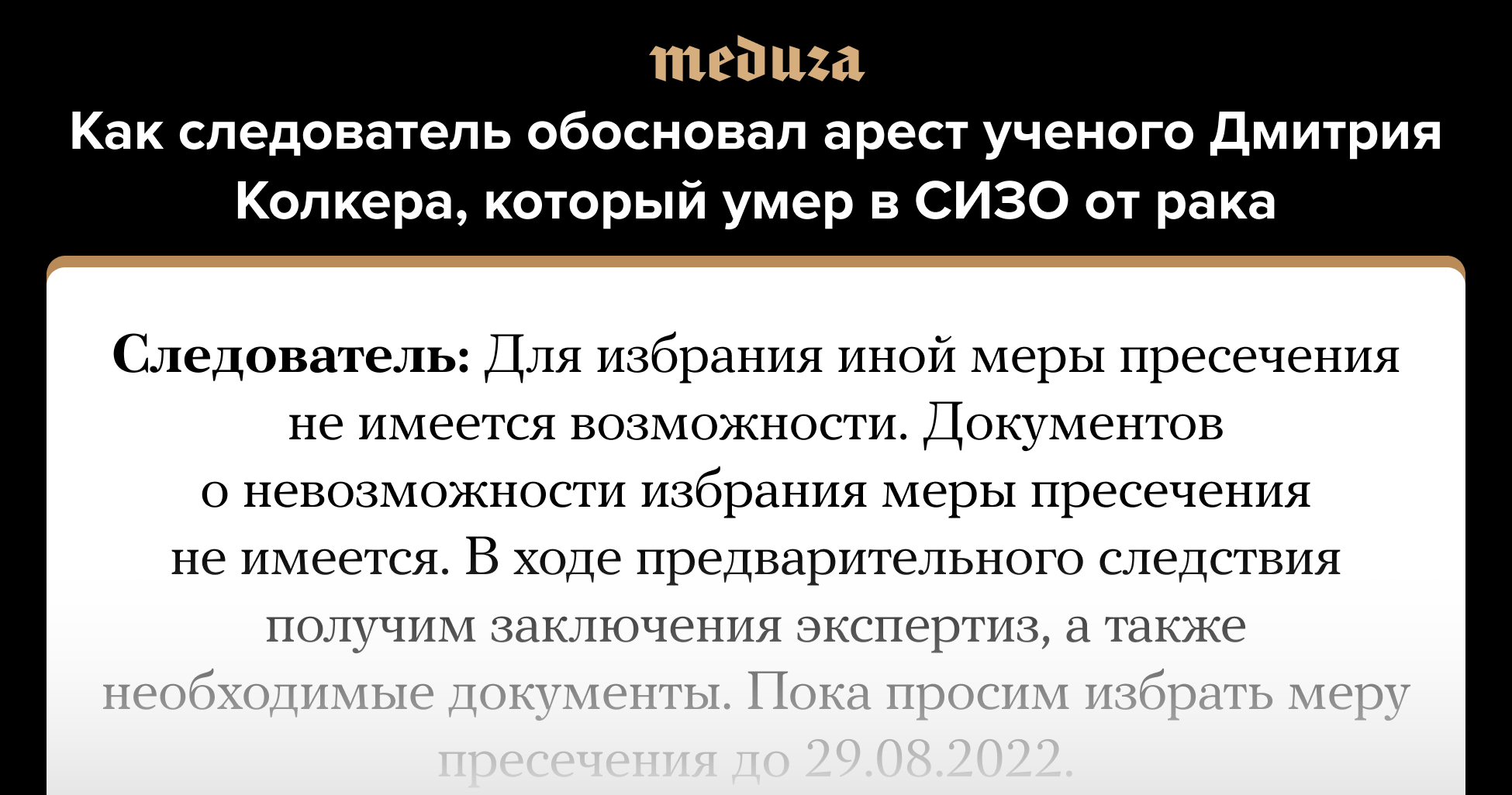 Новосибирский областной суд признал законным арест ученого Дмитрия Колкера, которого подозревали в госизмене. 30 июня его отправили из больницы в СИЗО, несмотря на четвертую стадию рака поджелудочной железы, 2 июля он умер в изоляторе. Правозащитник Павел Чиков опубликовал выдержки с заседания суда, на котором избиралась мера пресечения ученому. В частности, следователь заявлял, что в деле нет медицинских документов, препятствующих заключению Колкера под стражу, а также выразил уверенность, что ученый выживет в СИЗО.