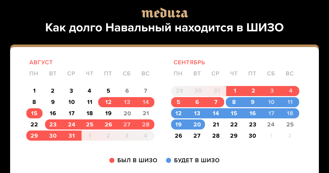 Российский политик Алексей Навальный, отбывающий заключение в колонии строгого режима № 6 во Владимирской области, сообщил, что его в четвертый раз за месяц отправили в штрафной изолятор. Первый раз его поместили в ШИЗО 12 августа на трое суток, затем — еще на пять и еще на семь суток. 5 сентября Навальный вышел из ШИЗО, но на следующий день его снова отправили в изолятор — на 15 суток. Политика объявили «злостным нарушителем», из-за чего он будет реже видеться с семьей. Ранее Навальному после нахождения в ШИЗО начали давать обезболивающее из-за болей в спине.
