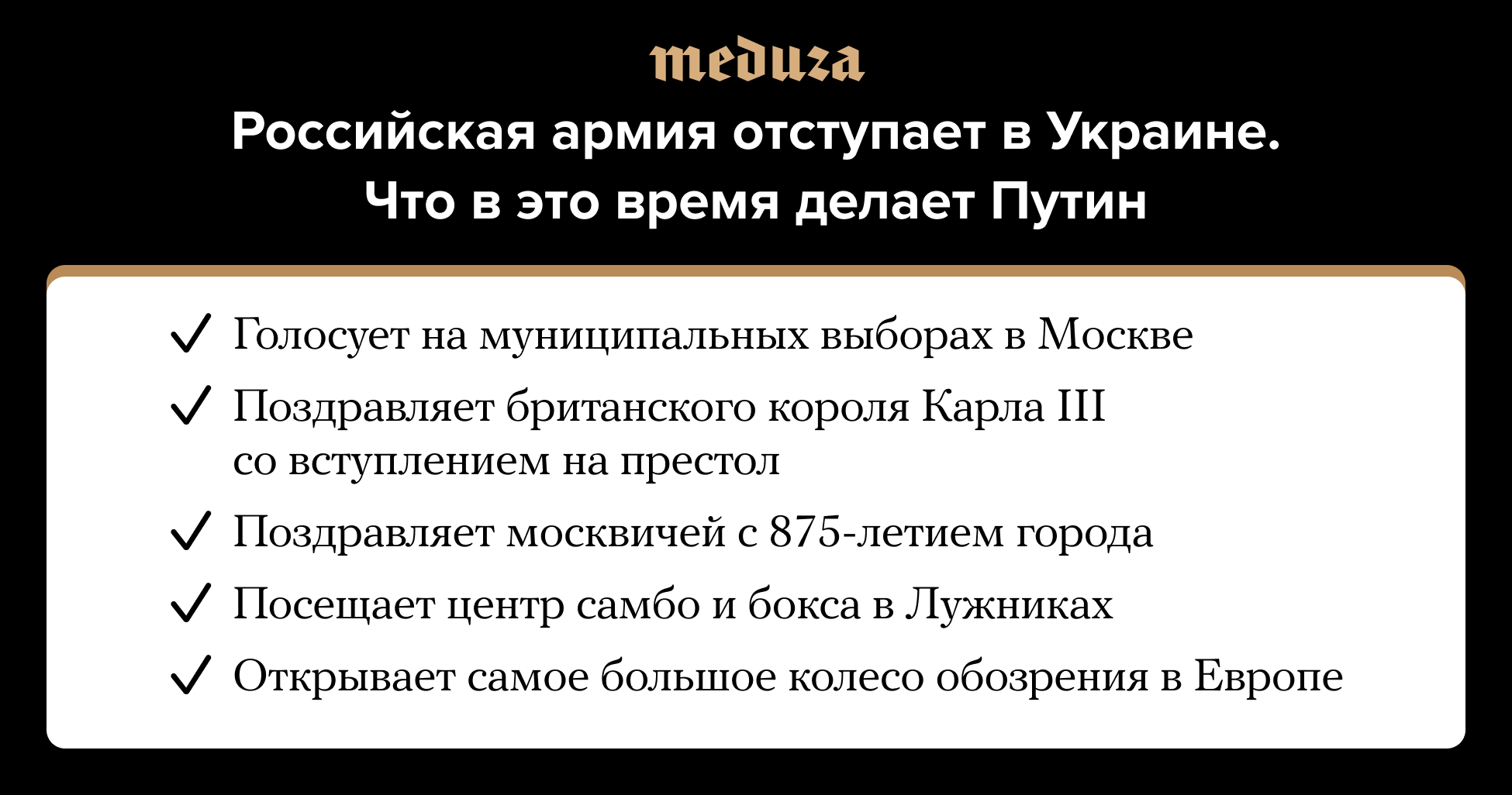 10 сентября Служба безопасности Украины заявила, что ВСУ вошли в Купянск — третий по величине город Харьковской области, который был оккупирован в первые дни войны. Источники с российской стороны также заявили, что российские войска под угрозой окружения оставили Изюм, расположенный к югу от Купянска. Кроме того, появилась информация о наступлении ВСУ на Лиман — город в Донецкой области недалеко от границы с Харьковской областью. На фоне отступления российских войск Минобороны РФ отключило комментарии во всех соцсетях. При этом официально российское военное ведомство пока не отреагировало на сообщения об отходе с ранее оккупированных территорий — как и президент России Владимир Путин. 10 сентября он принял участие в мероприятиях по случаю 875-летия Москвы, в том числе посетил международный центр самбо и бокса в спорткомплексе «Лужники» и (по видеосвязи) принял участие в церемонии запуска колеса обозрения «Солнце Москвы», которое является самым большим в Европе. Также Путин проголосовал онлайн на муниципальных выборах в Москве и поздравил британского короля Карла III со вступлением на престол.