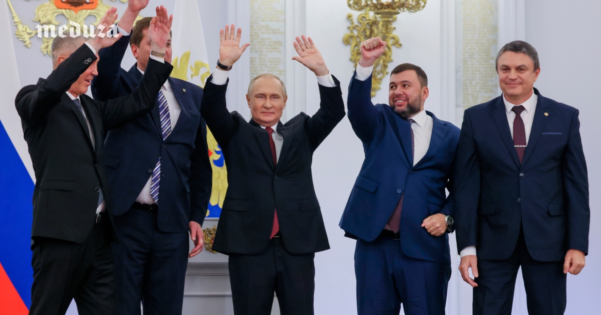 В Кремле днем 30 сентября состоялась церемония подписания договоров о «вступлении в состав России» оккупированных частей Украины. Официально аннексия будет завершена, когда Конституционный суд проверит ее на соответствие конституции, а парламент одобрит соответствующий федеральный конституционный закон — ожидается, что вся эта процедура займет лишь несколько дней. На фото слева направо: главы оккупационных администраций Херсонской и Запорожской областей Владимир Сальдо и Евгений Балицкий, президент РФ Владимир Путин, главы самопровозглашенных ДНР и ЛНР Денис Пушилин и Леонид Пасечник.