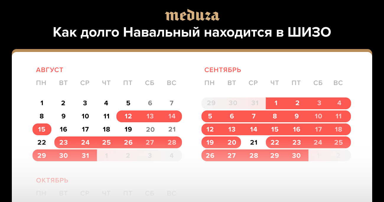 Политика Алексея Навального, отбывающего срок в ИК-6 во Владимирской области, 10 октября в шестой раз за последние два месяца отправили в штрафной изолятор. Как сообщается в соцсетях политика, причиной этому послужил отказ Навального мыть забор. Навальный вышел из ШИЗО неделю назад; в предыдущий раз он получил 12 суток за речь о мобилизации, сказанную на заседании суда. Адвокат Павел Чиков отметил, что несколько направлений в ШИЗО подряд могут стать основанием для перевода в ЕПКТ (Единые помещения камерного типа) — фактически одиночную камеру, где можно находиться до одного года. Также администрация колонии сможет ходатайствовать о переводе Навального в тюрьму на срок до трех лет.