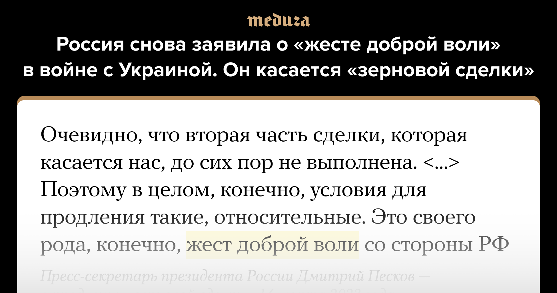 Пресс-секретарь президента РФ Дмитрий Песков 14 марта объяснил, почему Россия готова продлить «зерновую сделку» с Украиной лишь на 60 дней вместо 120. По словам Пескова, сама по себе готовность к продлению сделки уже является «жестом доброй воли» со стороны Москвы, так как российские условия в этой сделке не выполняются. Песков и другие представители российской власти уже не раз использовали выражение «жест доброй воли» (и не только его) для объяснения своих действий — в частности, так были названы отступления российских военных из Киевской и Черниговской областей прошлой весной и с острова Змеиный возле Одессы прошлым летом. Выражение «жест доброй воли» стало мемом, а президент Украины Владимир Зеленский после отвода российских войск из Херсона говорил: «Враг не делает нам подарков, не делает „жестов доброй воли“. Мы за все это боремся».