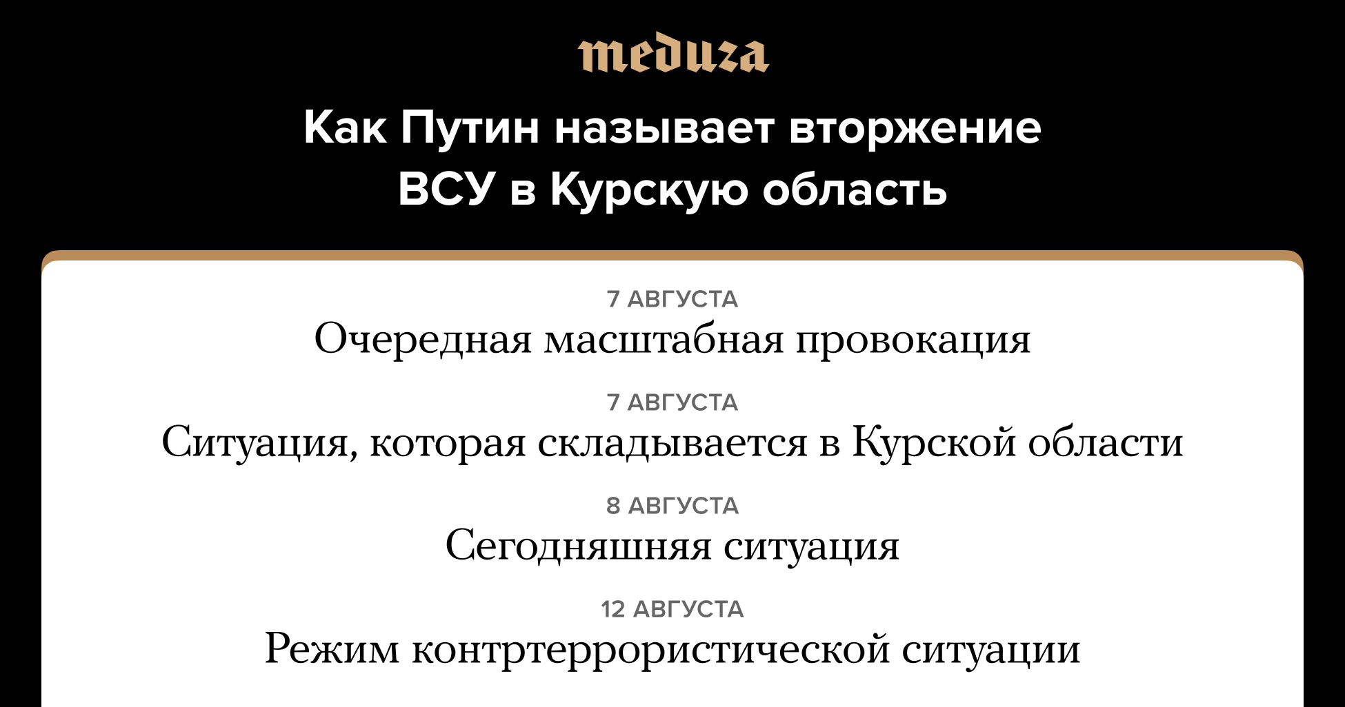 Вооруженные силы Украины 6 августа начали наступление в Курской области, захватив 28 населенных пунктов. Президент РФ Владимир Путин впервые прокомментировал вторжение ВСУ 7 августа, назвав его «масштабной провокацией». В следующие дни Путин несколько раз затрагивал эту тему на своих встречах и совещаниях. Судя по сообщениям на сайте Кремля от 7, 8 и 12 августа, Путин несколько раз называл наступление украинской армии просто «ситуацией».