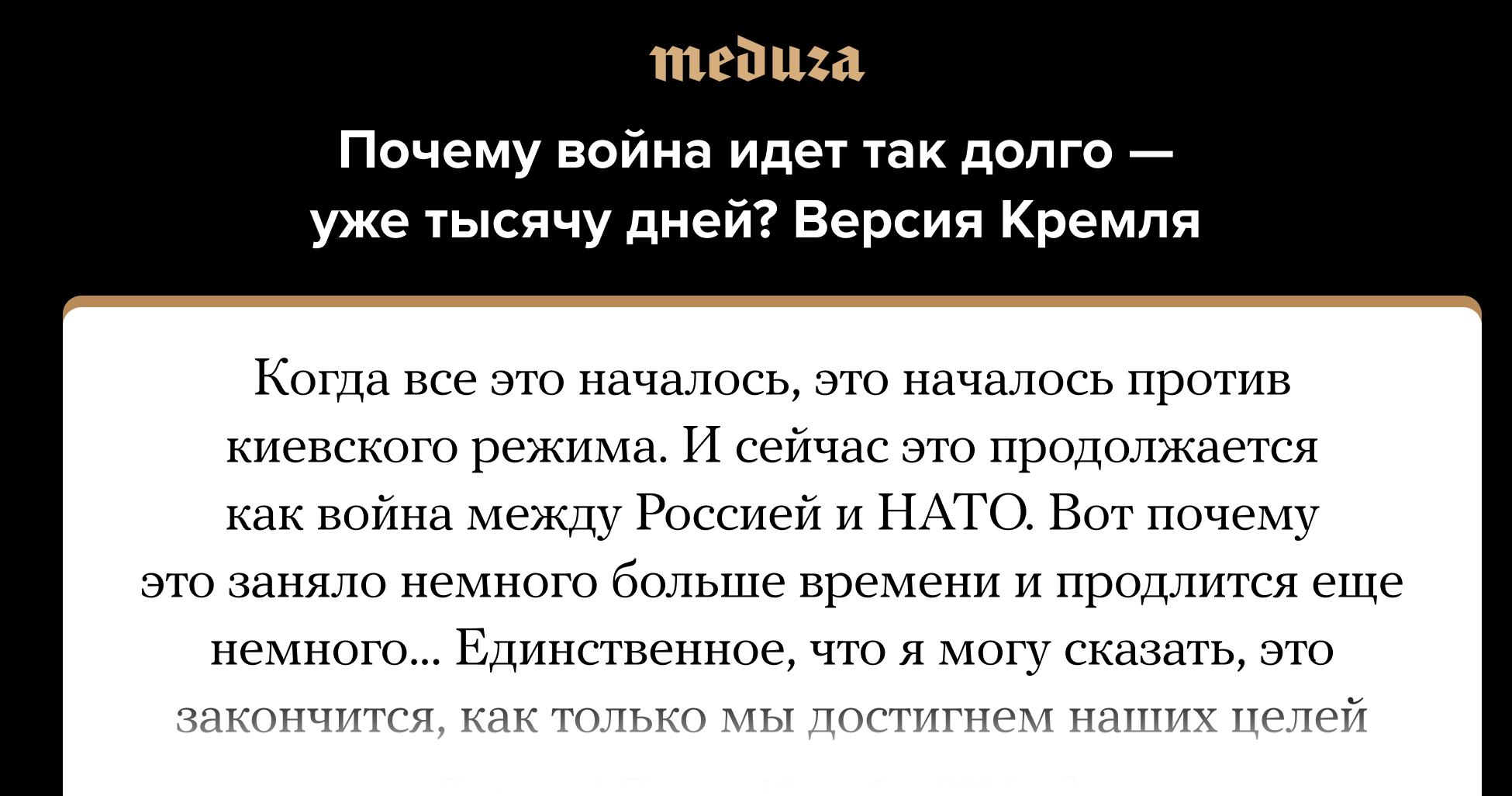 Почему война идет так долго — уже тысячу дней? Версия Кремля «Это заняло немного больше времени и продлится еще немного»