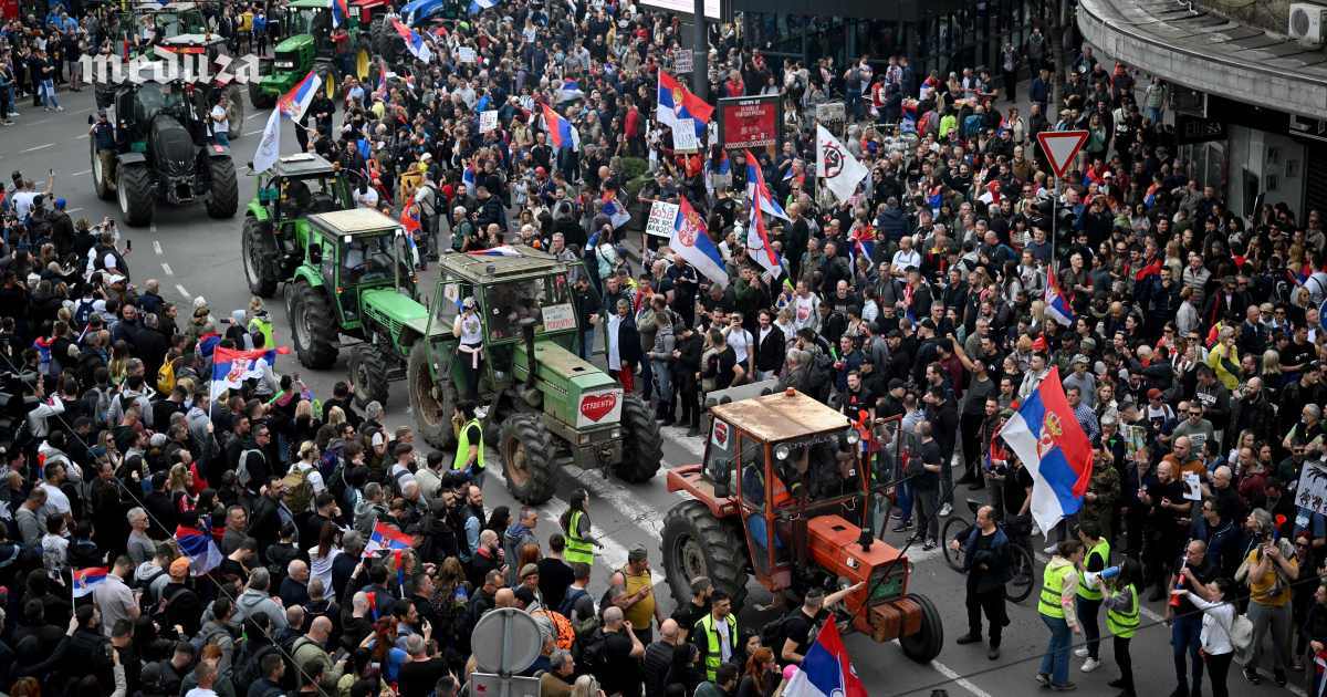 В Белграде больше 100 тысяч человек протестуют против правительства. Фермеры приехали на тракторах. Фотография