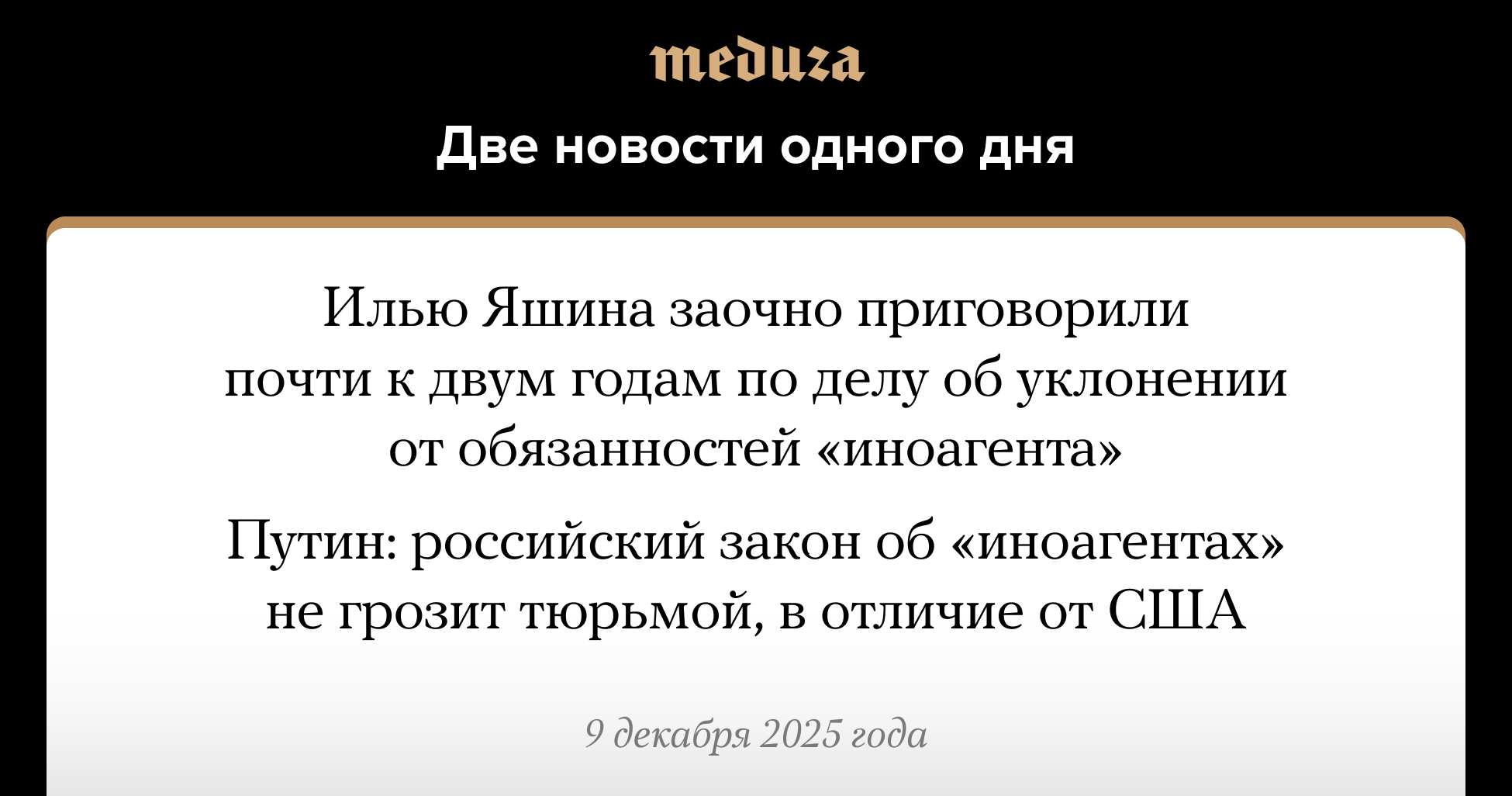 Владимир Путин заявил 9 декабря, что действующий в России закон об «иностранных агентах» мягче, чем аналогичный закон в США. «Там нарушение этого закона грозит тюремным заключением, у нас же нет такого», — сказал президент РФ на заседании Совета по правам человека (СПЧ), комментируя выступление режиссера Александра Сокурова. В этот же день московский суд заочно <a href="https://zona.media/news/2025/12/09/yashin" rel="noopener noreferrer" target="_blank">приговорил</a> политика Илью Яшина к одному году и 10 месяцам лишения свободы по делу об уклонении от обязанностей «иноагента» (статья 330.1 УК). Максимальное наказание по этой статье — два года лишения свободы. Владимир Путин неоднократно подписывал поправки, ужесточающие законодательство об «иноагентах». В том числе, в октябре 2025-го он <a href="https://open-mind-network.online/news/2025/10/15/putin-podpisal-zakon-pozvolyayuschiy-vozbuzhdat-ugolovnye-dela-protiv-inoagentov-posle-odnogo-shtrafa-vmesto-dvuh" rel="noopener noreferrer" target="_blank">разрешил</a> возбуждать уголовные дела против «иноагентов» после одного административного штрафа вместо двух.