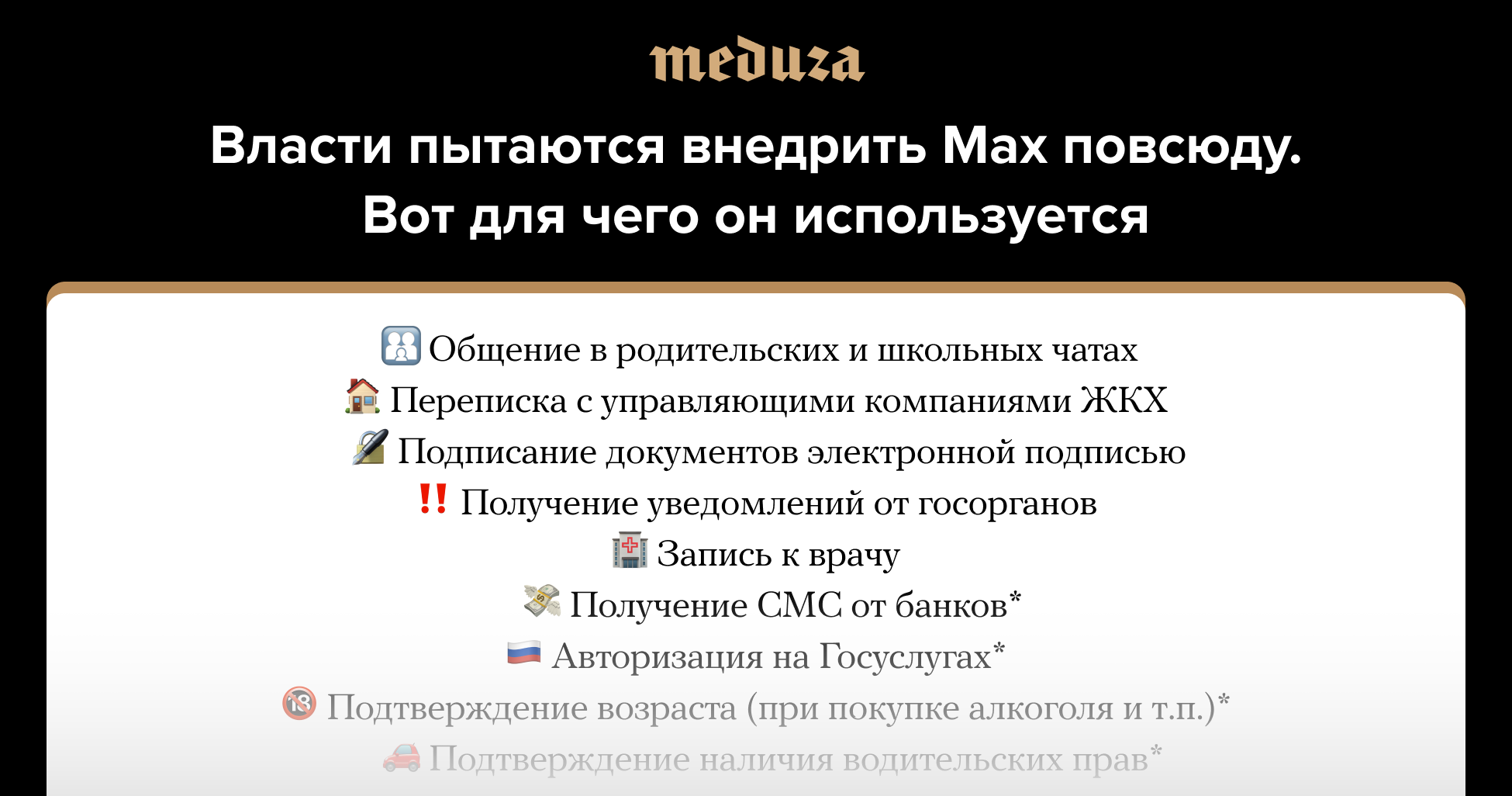 Комитет Госдумы по информполитике 16 декабря рекомендовал принять изменения в законодательство, которые дают возможность подтверждать через мессенджер Max возраст при покупке товаров с возрастными ограничениями. 17 декабря «Коммерсант» написал, что Минцифры обсуждает возможность перевода в мессенджер СМС-уведомлений от банков. В последние месяцы власти добавляют все больше функций в Max (параллельно ограничивая использование других платформ).