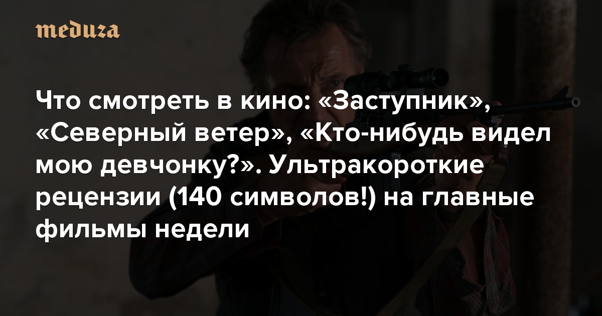 Каждые выходные на «Медузе» выходят ультракороткие рецензии — примерно 140 знаков каждая — от кинокритика Антона Долина, которые помогают ориентироваться в прокате. На этой неделе в кинотеатрах покажут боевик «Заступник» с Лиамом Нисаном, фильм Ренаты Литвиновой «Северный ветер», драму «Кто-нибудь видел мою девчонку?» с Анной Чиповской и мультфильм «Огонек-Огниво» по сказке Андерсена.